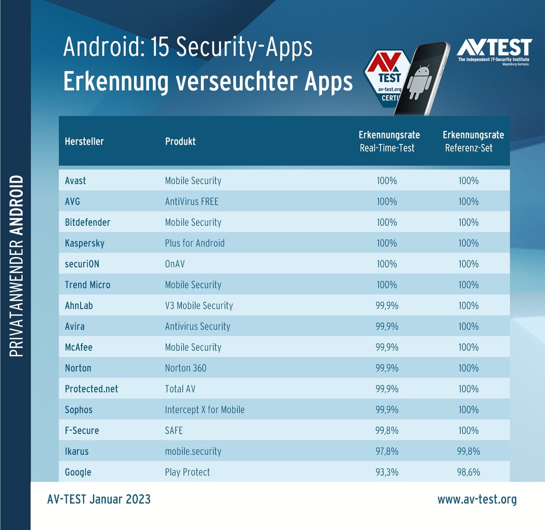 Das Testlabor von AV-TEST untersucht die Leistung von 14 Sicherheits-Apps. Dem gegenüber steht als 15. App der festinstallierte Service Google Play Protect. Alle Apps werden auf ihre Schutzwirkung, Geschwindigkeit und Benutzbarkeit untersucht. Für jeden Bereich vergibt das Labor bis zu 6 Punkte. Die besten Apps in der Prüfung erreichen so bis zu 18 Punkte. Der Test ist insbesondere auf die Geräte von Privatanwender ausgerichtet. So werden etwa auch Spiele oder Entertainment-Apps installiert und weniger Business-Applikationen. Im Test finden sich die Schutz-Apps von AhnLab, Avast, AVG, Avira, Bitdefender, F-Secure, Google, Ikarus, Kaspersky, McAfee, Norton, Protected.net, securiON, Sophos und Trend Micro.
