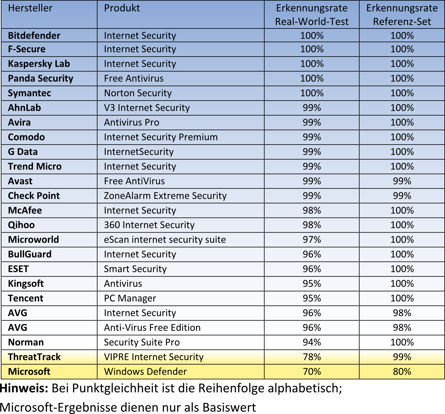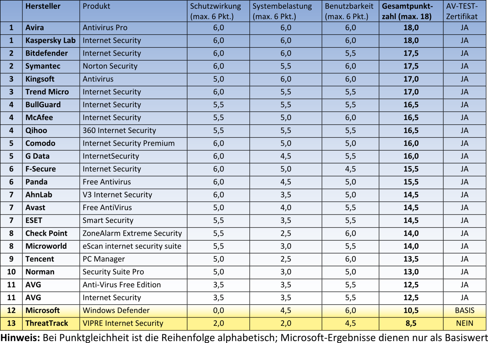 Der zum Vergleich mit getestete Basisschutz von Windows in Form des Windows Defenders bekam nur 10,5 Punkte. Für seine schwache Erkennungsleistung hatten die Tester keinerlei Punkte übrig.