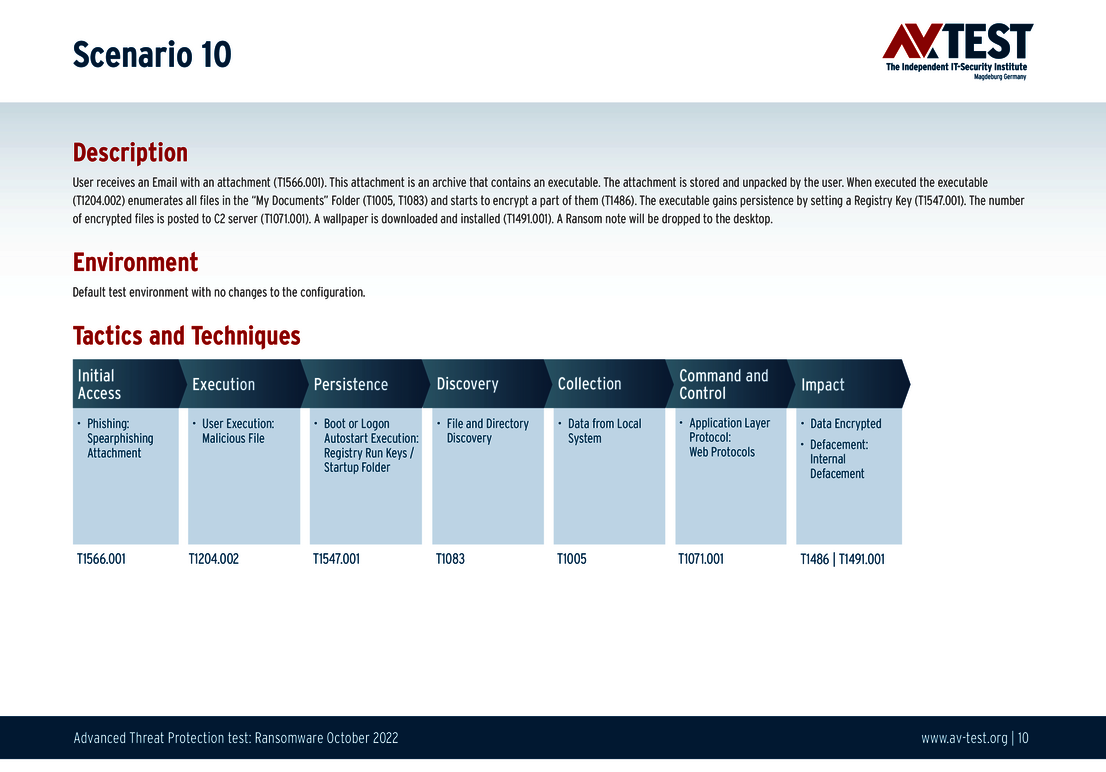 Die Testreihe Advanced Threat Protection ist für jedes untersuchte Produkt eine Herausforderung, da es wie im Alltag auf schwierige und dynamische Angriffs-Szenarien trifft. Die in diesem Test genutzten Abläufe beschreiben die 10 abgebildeten Reiter mit den Szenarien 1 bis 10. Damit Fachleute den Test leichter nachvollziehen können, nutzt das Labor zur Beschreibung die international definierten „Techniques“ Codes von MITRE ATT&CK.