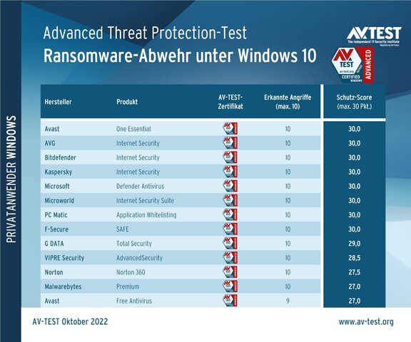 Avast mit One Essential, AVG, Bitdefender, F-Secure, Kaspersky, Microsoft, Microworld und PC Matic erkennen alle speziellen Angriffstechniken der verschiedenen 10 Ransomware-Szenarien und bekommen die maximalen 30 Punkte für den Schutz-Score.