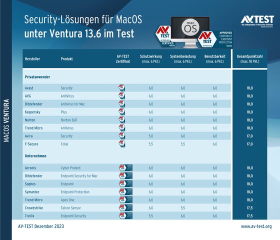 Das Labor von AV-TEST hat 7 Business-Lösungen und 8 Schutzpakete für Privatanwender unter MacOS Ventura 13.6 im Dezember 2023 ausführlich getestet. Untersucht und bewertet wurden die Bereiche Schutzwirkung, Systembelastung und Benutzbarkeit. Der letzte Punkt untersucht hauptsächlich mögliche Fehlalarme der Schutzprodukte. Für jeden Testabschnitt kann ein Produkt bis zu 6 Punkte einheimsen. Das Bestergebnis liegt somit bei 18 Punkten.
