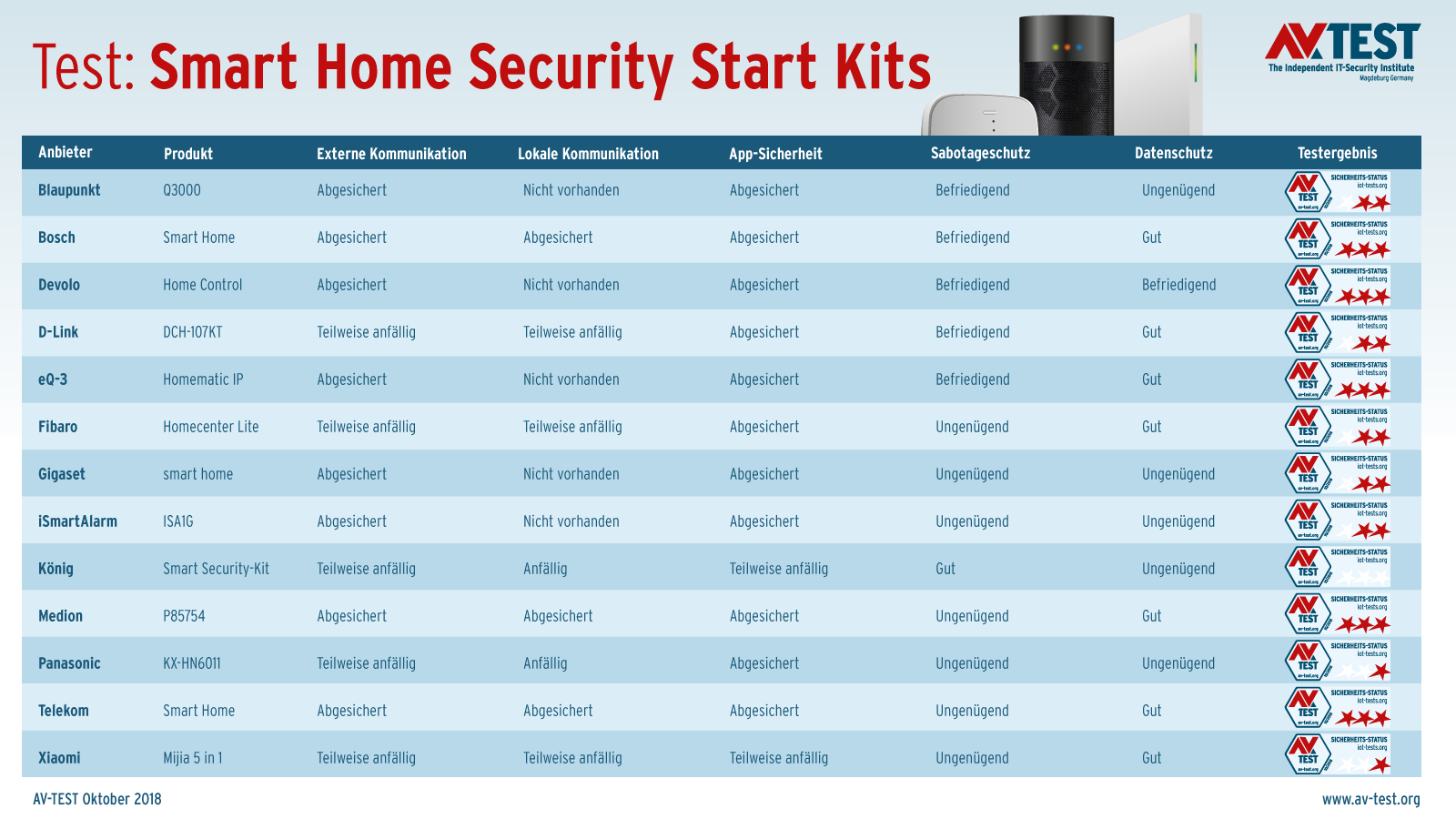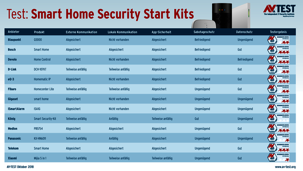Mit zum Teil groben Sicherheitsmängeln und nur einem Stern können die „KX-HN6011“ von Panasonic sowie die „Mijia 5 in 1“ von Xiaomi nicht zur Überwachung der eigenen vier Wände empfohlen werden. Aufgrund extremer Sicherheitsmängel fällt das „Smart Security-Kit“ von König mit null von drei möglichen Sternen in nahezu jeder Kategorie dieses Sicherheitstests durch und trägt nach Ansicht der Tester seinen Namen zu Unrecht.