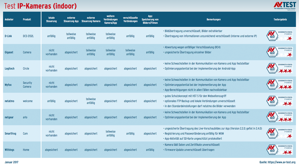Welche aktuellen IP-Kameras sich im Sicherheits-Check von AV-TEST empfohlen haben, verrät die folgende Testtabelle. Regelmäßige Tests zur Sicherheit von IoT- und Smart Home-Produkten finden Sie auf der Website von AV-TEST sowie in unserem IoT-Blog.