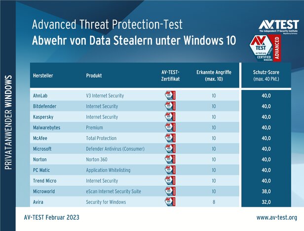 Das Labor von AV-TEST hat im Januar und Februar 2023 in seinem Advanced Threat Protection-Test 24 Schutzprodukte unter Windows 10 für private Nutzer und Unternehmen gegen Data Stealer getestet. Dabei mussten die Produkte die Angreifer erkennen oder in weiteren Schritten mit diversen Abwehrtechniken aufhalten und die Systeme in 10 Szenarien schützen. Für jeden Schritt innerhalb eines Szenarios, wie die Erkennung oder die Nutzung von weiteren Techniken vergibt das Labor bis zu 4 Punkte. Damit können die Produkte bis zu 40 Punkte für ihren Schutz-Score erreichen. Das leisten bei den Paketen für private Anwender 9 der 11 untersuchten Produkte. Bei den Unternehmenslösungen schließen 10 der 13 Testkandidaten den Test mit der maximalen Punktzahl von 40 ab.