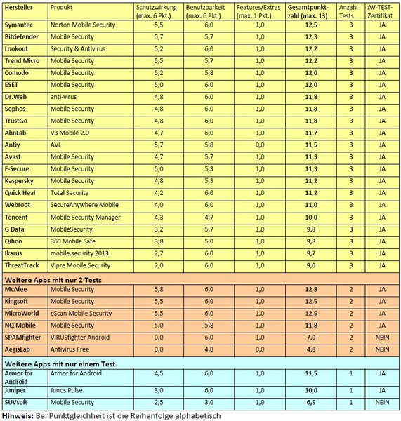 Gleich sechs Apps liegen in der Wertung nach drei Tests zwischen 12,0 und 12,5 von 13,0 möglichen Punkten. Norton Mobile Security von Symantec liegt ganz knapp vor den Apps von Bitdefender, Lookout und Trend Micro. In nur zwei Tests (daher nicht im oberen Abschnitt) zeigten die Apps von McAfee, Kingsoft und MicroWorld bisher eine gute Gesamtleistung. (Info: ehemals GFI ist nun ThreatTrack).