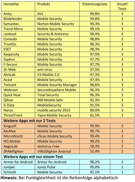 Die Apps von Symantec und Trend Micro liegen nach drei Tests im Schnitt bei über 99 Prozent Erkennung beim Scannen nach Schädlingen. Die folgenden Apps erreichten immer noch gute Scanraten zwischen 98,9 und 96,3 Prozent: Lookout, Comodo, TrustGo, ESET, Kaspersky, Sophos. F-Secure, Dr.Web, AhnLab, Avast, Tencent, Webroot und Quick Heal.
