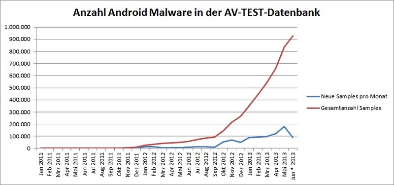 Die Menge an neuen Schädlingen für Android wächst rasant an. Im Juli 2013 wird die Marke bei geschätzten 1,1 Millionen Samples stehen. Das wäre dann von Juli 2012 bis Juli 2013 ein Zuwachs von einer Million Angreifern für Android.