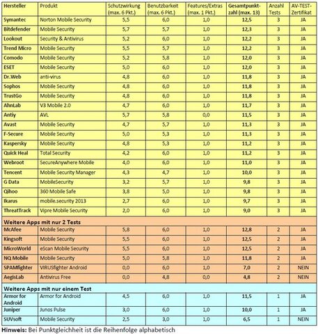 Die Gesamtwertung der Security-Apps für Android im Dauertest Januar bis Juni 2013