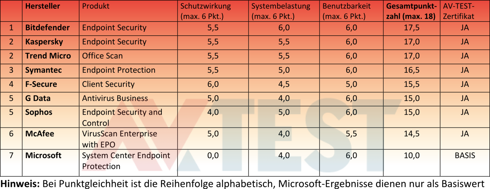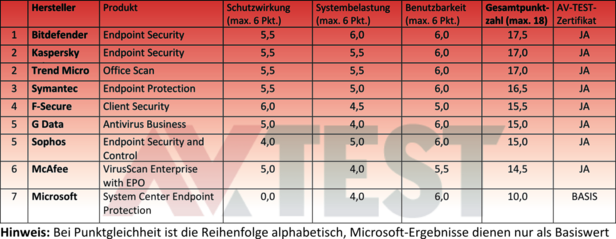 Die höchste erreichbare Punktzahl für Schutzwirkung, Systembelastung und Benutzbarkeit im Test lag bei 18 Punkten. Diesen Wert hat die Schutz-Lösung von Bitdefender mit 17,5 Punkten nur knapp verfehlt. Mit je 17 Punkten folgen die Systemwächter für Unternehmen von Kaspersky Lab und Trend Micro. Rang 3 schaffte Symantec mit insgesamt 16,5 Punkten.