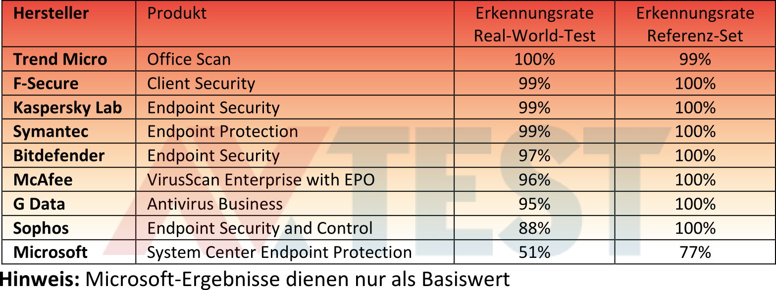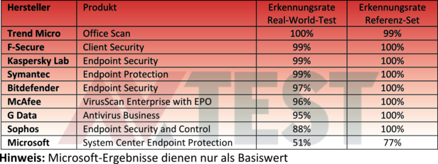 Im Labor von AV-TEST wurden 8 Produkte für die Client-Server-Umgebung unter Windows 7 geprüft. Mit im Test waren Lösungen von Bitdefender, F-Secure, G Data, Kaspersky Lab, McAfee, Sophos, Symantec und Trend Micro. Für den besseren Vergleich wurde die Antivirus-Lösung von Microsoft als Basisschutz mitgetestet. Besitzer der Microsoft-Management-Suite System Center 2012 können das Modul Endpoint Protection 2012 kostenlos nutzen. Getrennt erwerben lässt es sich aber nicht.