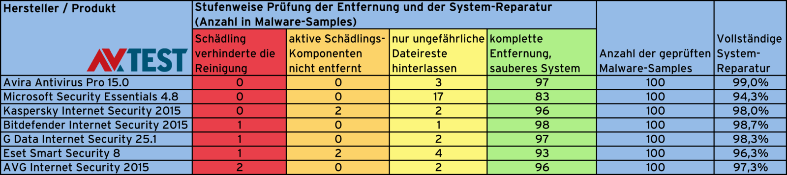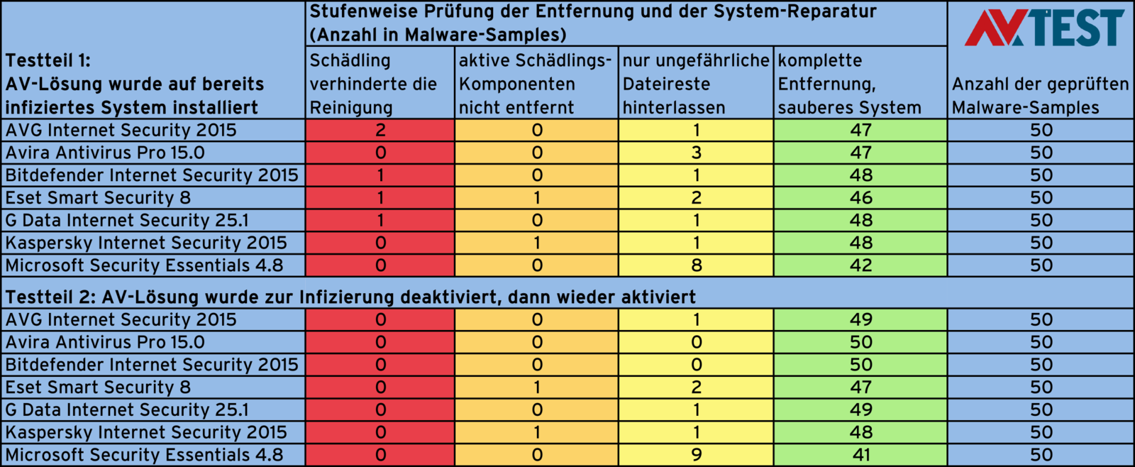Der aktuelle Dauertest lief über das Jahr 2015 und 4 Testrunden. In zwei Testszenarien wurden Windows-Systeme manuell mit jeweils 50 ausgesuchten Schädlingen verseucht.