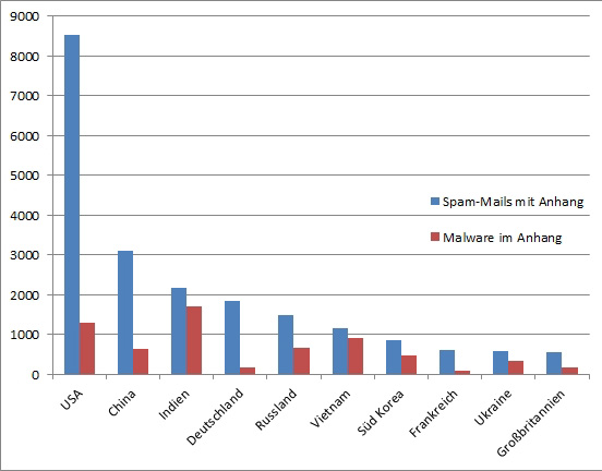Von den 30.000 registrierten Spam-Mails mit Anhängen kam die Hälfte aus den USA, China, Indien und sogar Deutschland. Der deutsche Spam mit Anhang war aber nicht so gefährlich: 10 Prozent der Mails hatten einen Schädling mit im Gepäck.