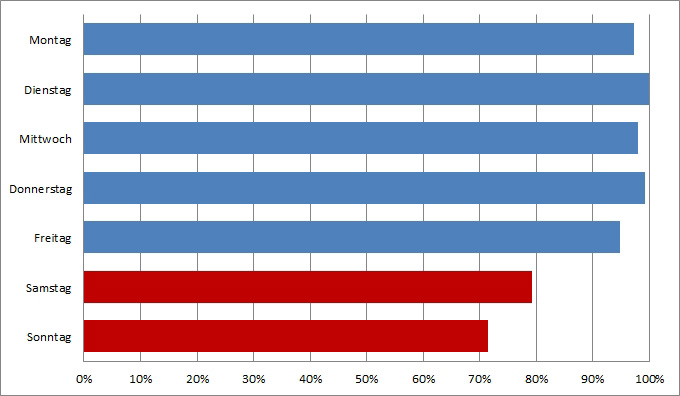 Für die Studie wurde der Spam an jedem Wochentag registriert. Das Maxi-mum lag bei etwa 80.000 Mails. Von Montag bis Freitag ist der Spam-Versand recht gleichmäßig. Am Wochenende fällt er deutlich ab. Das belegt: diese PCs stehen in Büros und sind am Wochenende ausgeschaltet. Somit stehen 25% der Spam verschickenden Botnetz-PCs in Büros – auch in deutschen