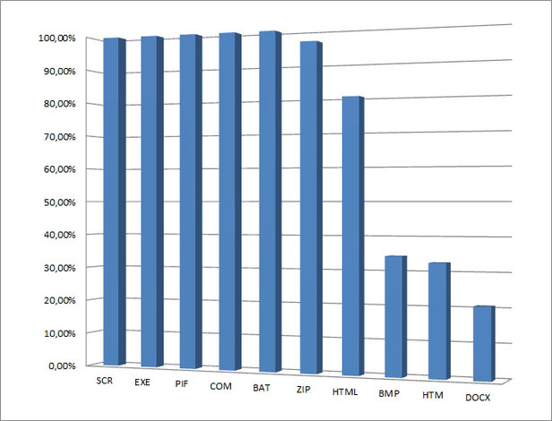 Bei den infizierten Mailanhängen fanden sich meistens die klassischen Vertreter: ZIP-Dateien, ausführbare EXE-, COM-, SCR-, BAT- oder PIF-Dateien und HTML-Dokumente für eine Attacke. Aber auch PDF-Dateien und Bilder sind weiterhin beliebt als infizierte Objekte. Die Studie belegt: sobald an einer Spam-Mail eine ZIP-Datei hängt, ist diese zu fast 100 Prozent verseucht. Bei den ausführbaren Dateien wie EXE oder PIF ist das ebenfalls der Fall. Die an die Spam-Mails angehängten HTML-Dokumente waren während der Studie zu über 80 Prozent verseucht.