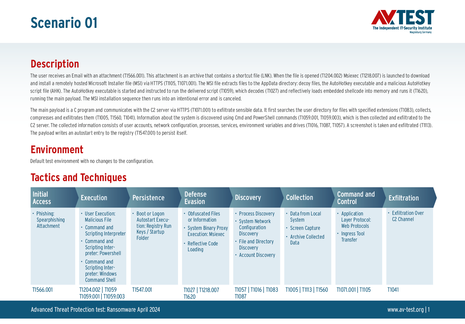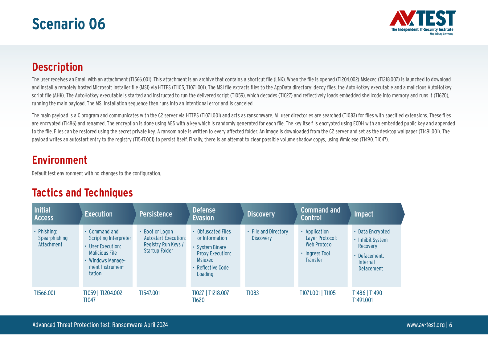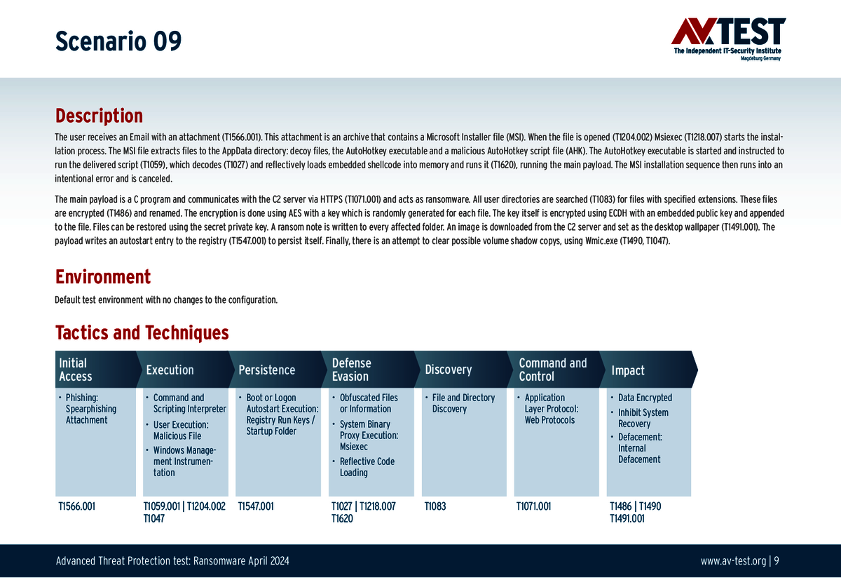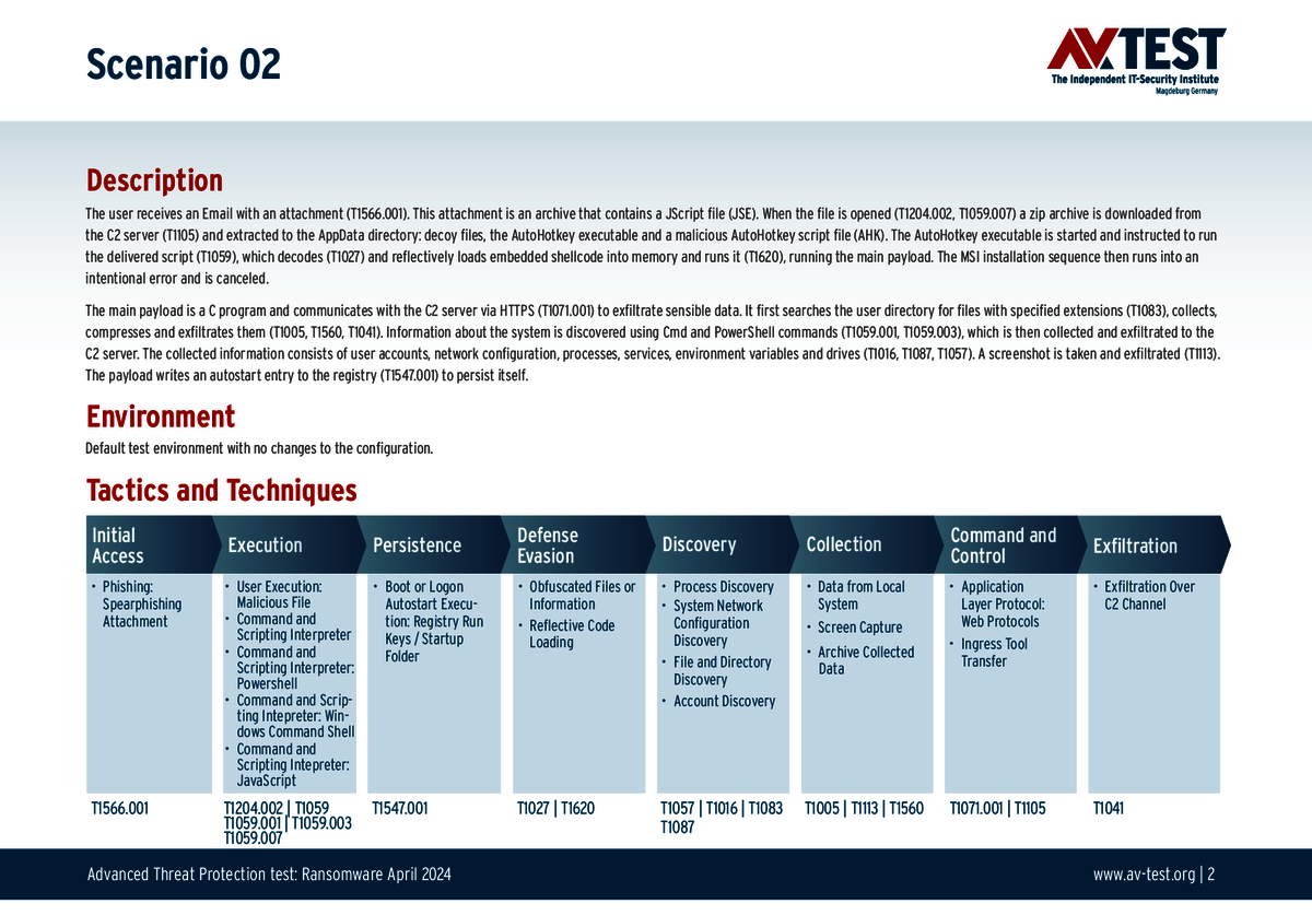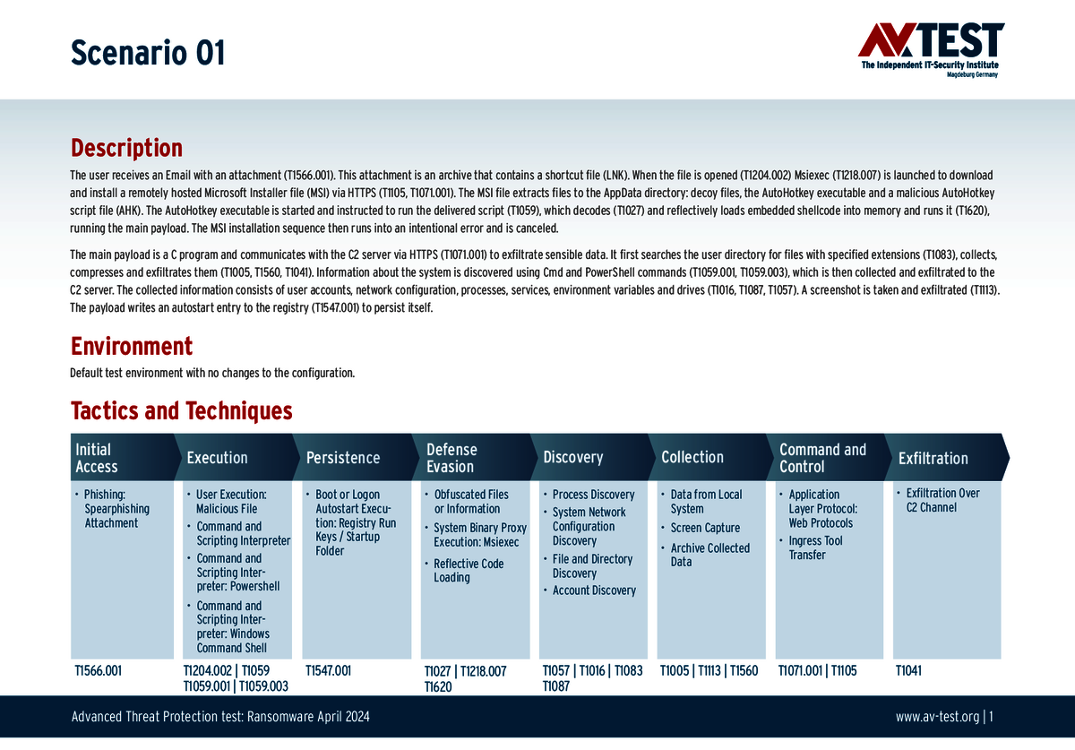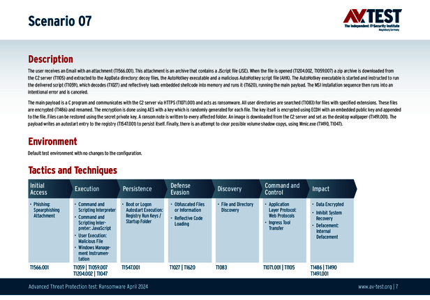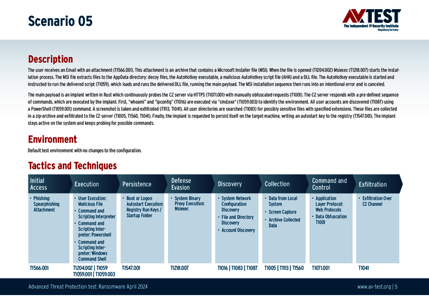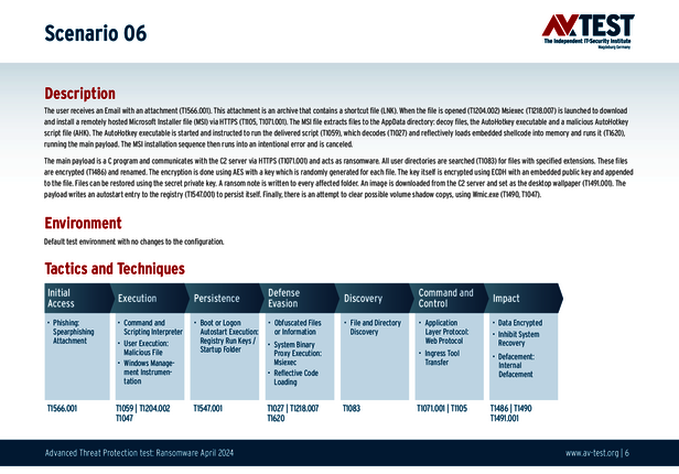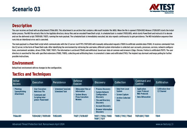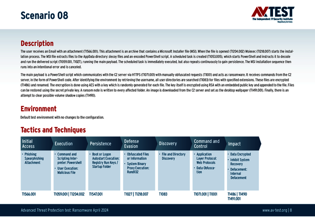 Alle Angriffs-Szenarien sind dokumentiert nach dem Standard der MITRE ATT&CK-Datenbank. Die einzelnen Unterpunkte, z.B. „T1566.001,“ stehen in der MITRE-Datenbank für „Techniques“ unter „Phishing: Spearphishing Attachment“. Jeder Testschritt ist so unter Fachleuten definiert und lässt sich nachvollziehen. Zusätzlich sind alle Angriffstechniken erklärt und wie dabei die Malware zum Zuge kommt.