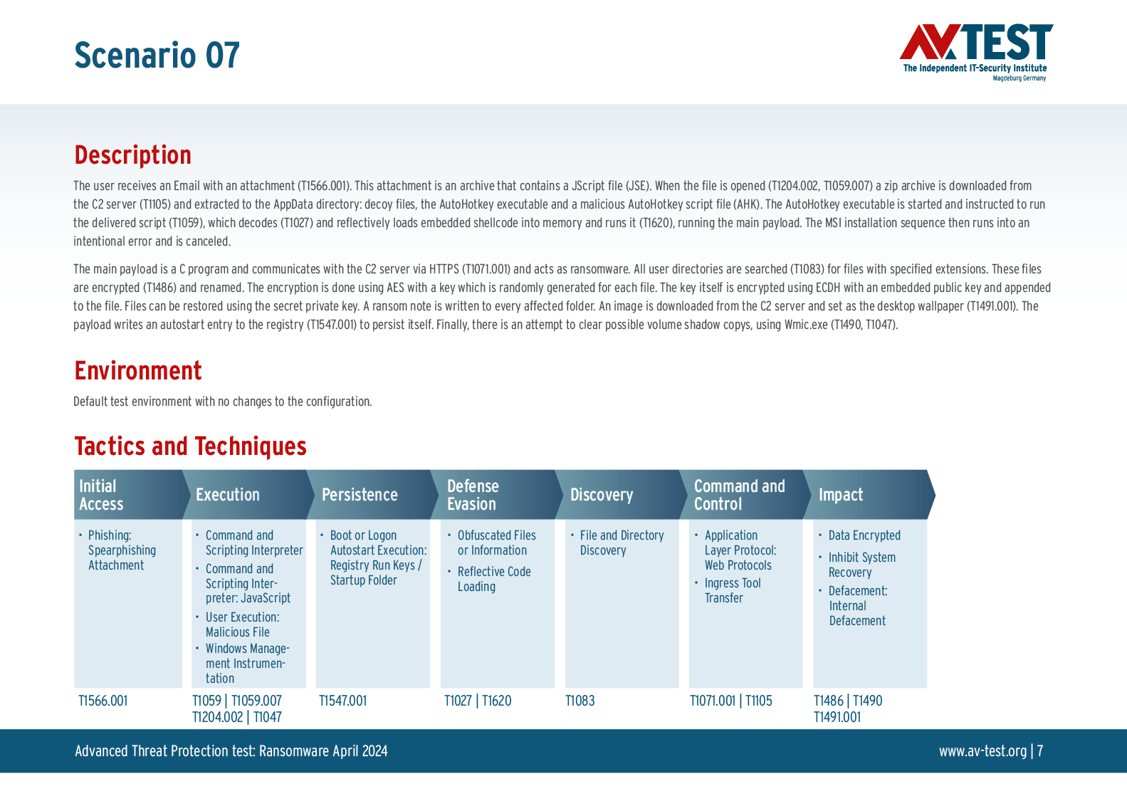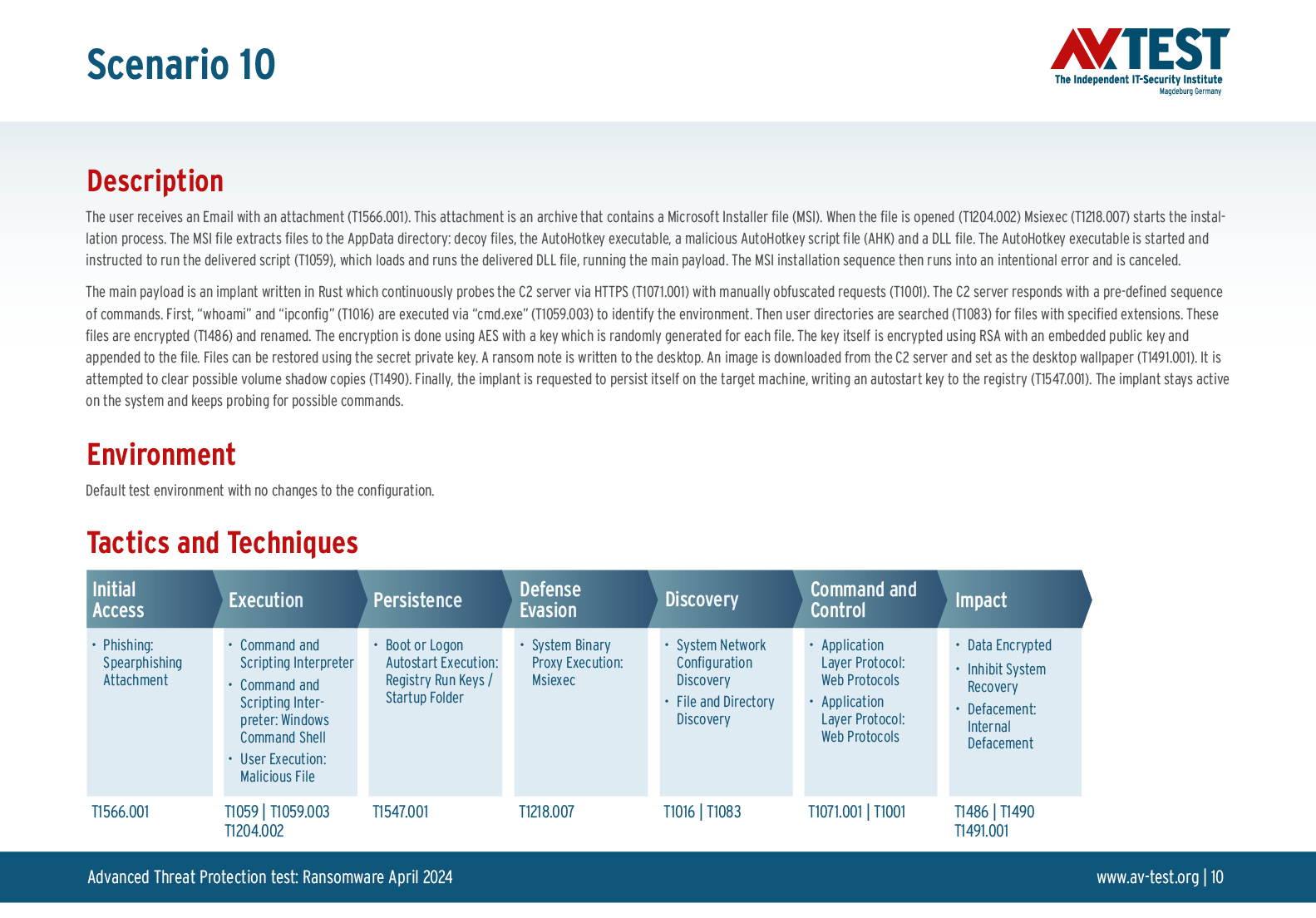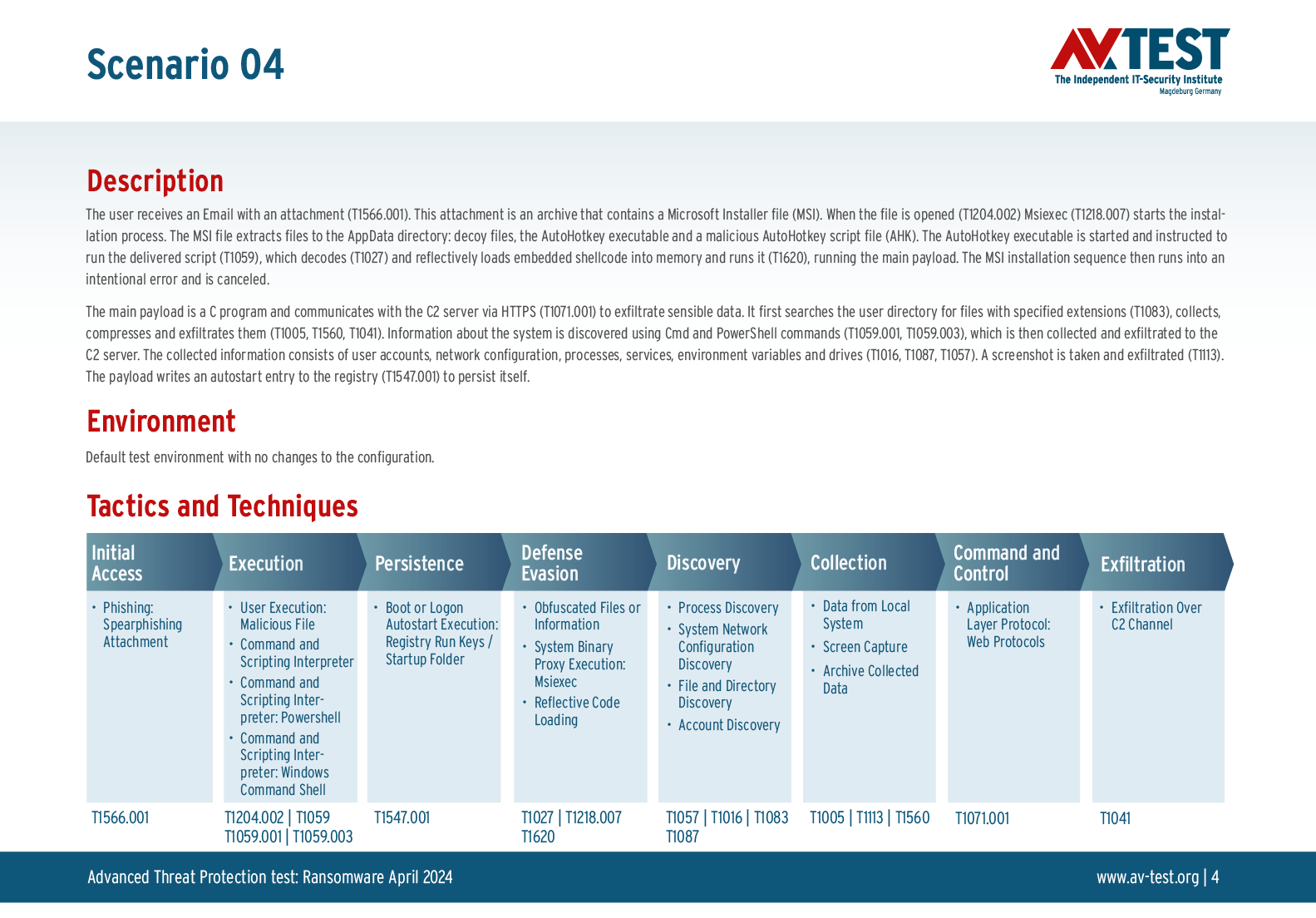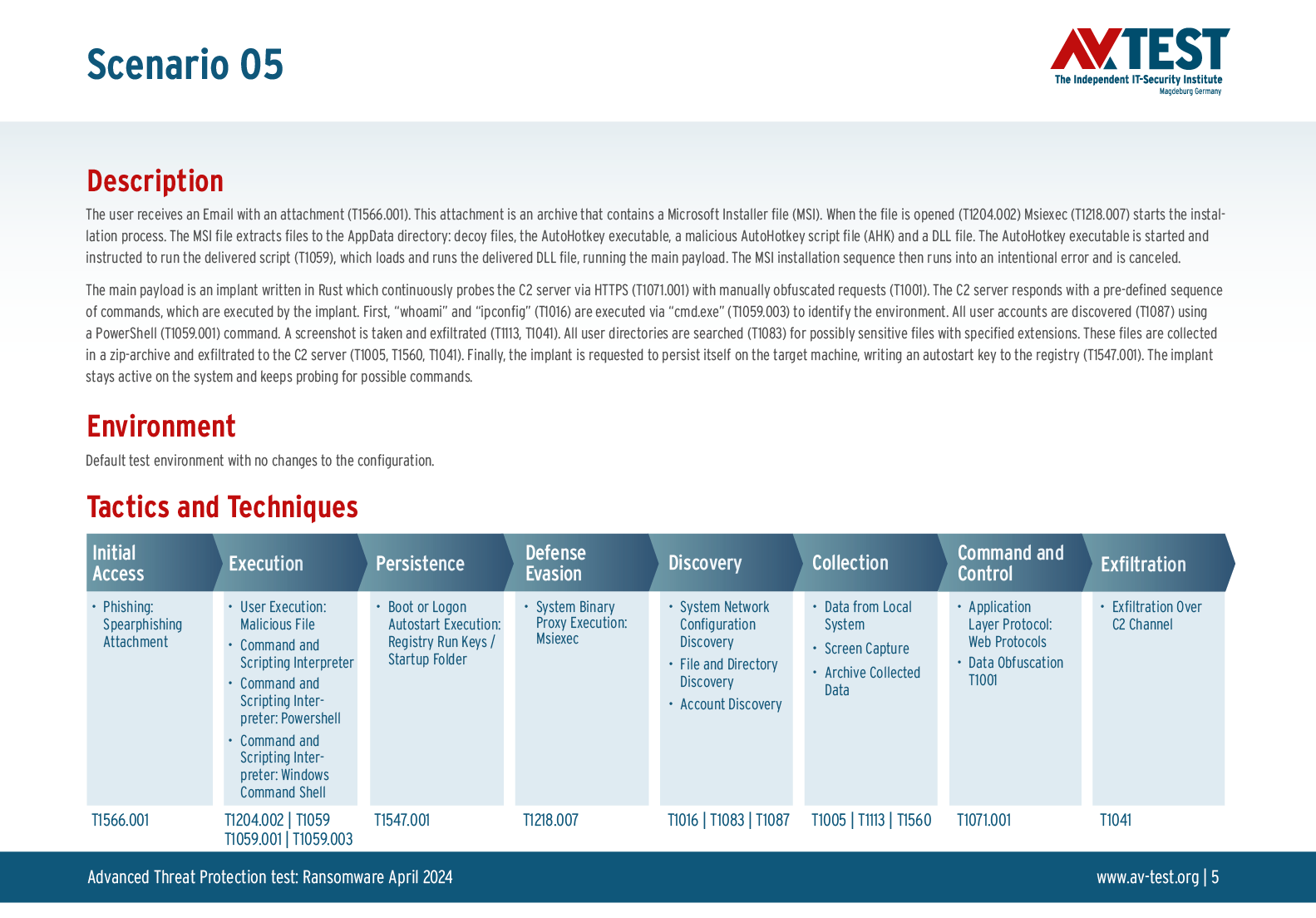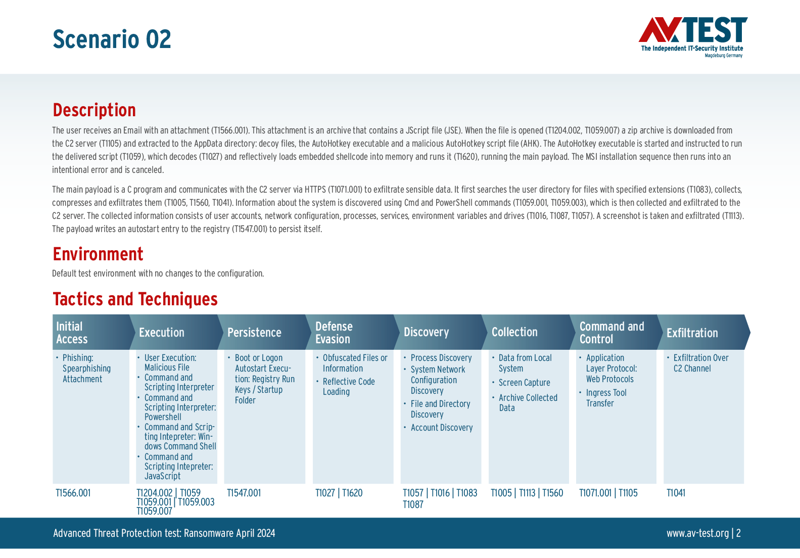 Alle Angriffs-Szenarien sind dokumentiert nach dem Standard der MITRE ATT&CK-Datenbank. Die einzelnen Unterpunkte, z.B. „T1566.001,“ stehen in der MITRE-Datenbank für „Techniques“ unter „Phishing: Spearphishing Attachment“. Jeder Testschritt ist so unter Fachleuten definiert und lässt sich nachvollziehen. Zusätzlich sind alle Angriffstechniken erklärt und wie dabei die Malware zum Zuge kommt.