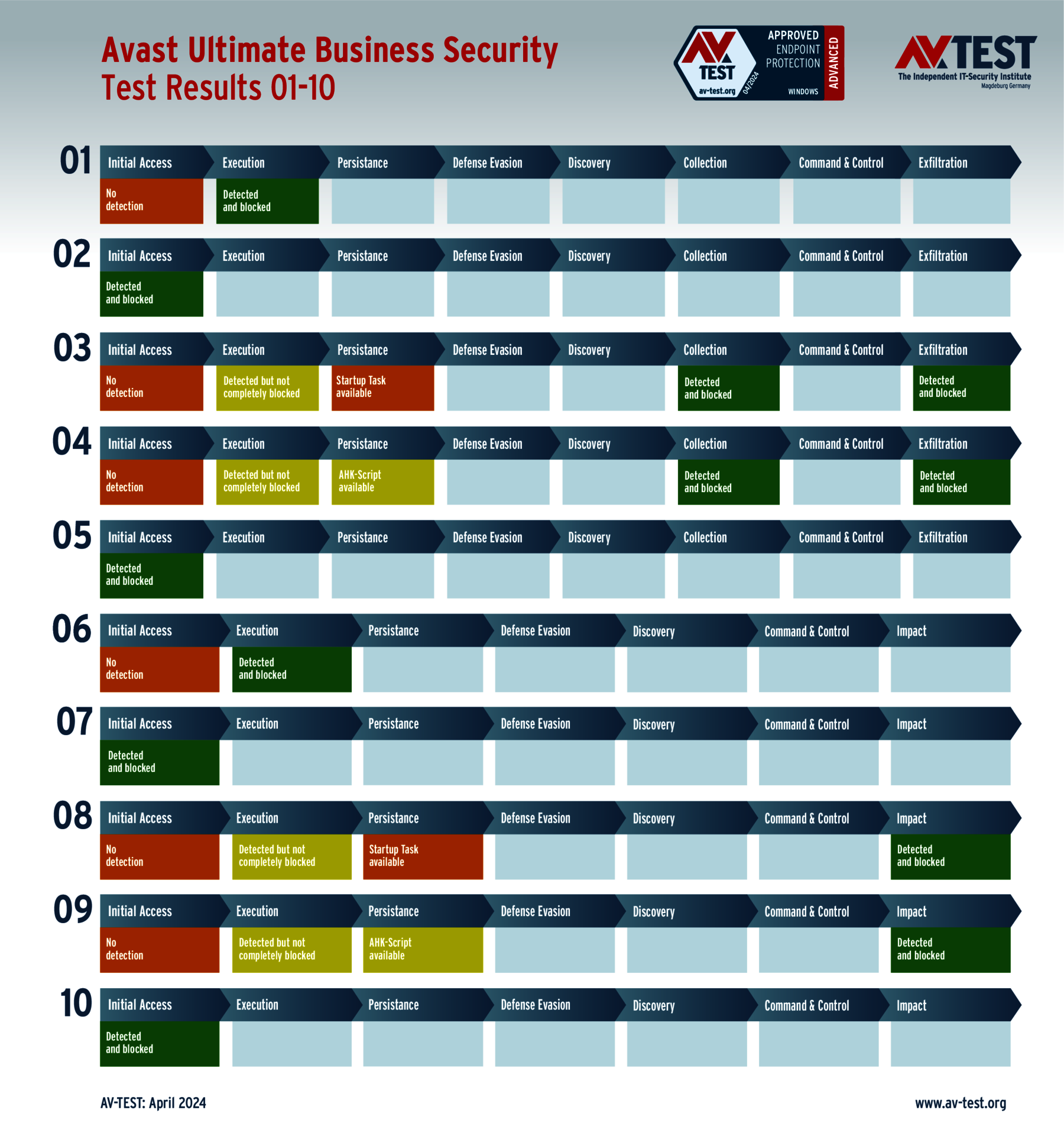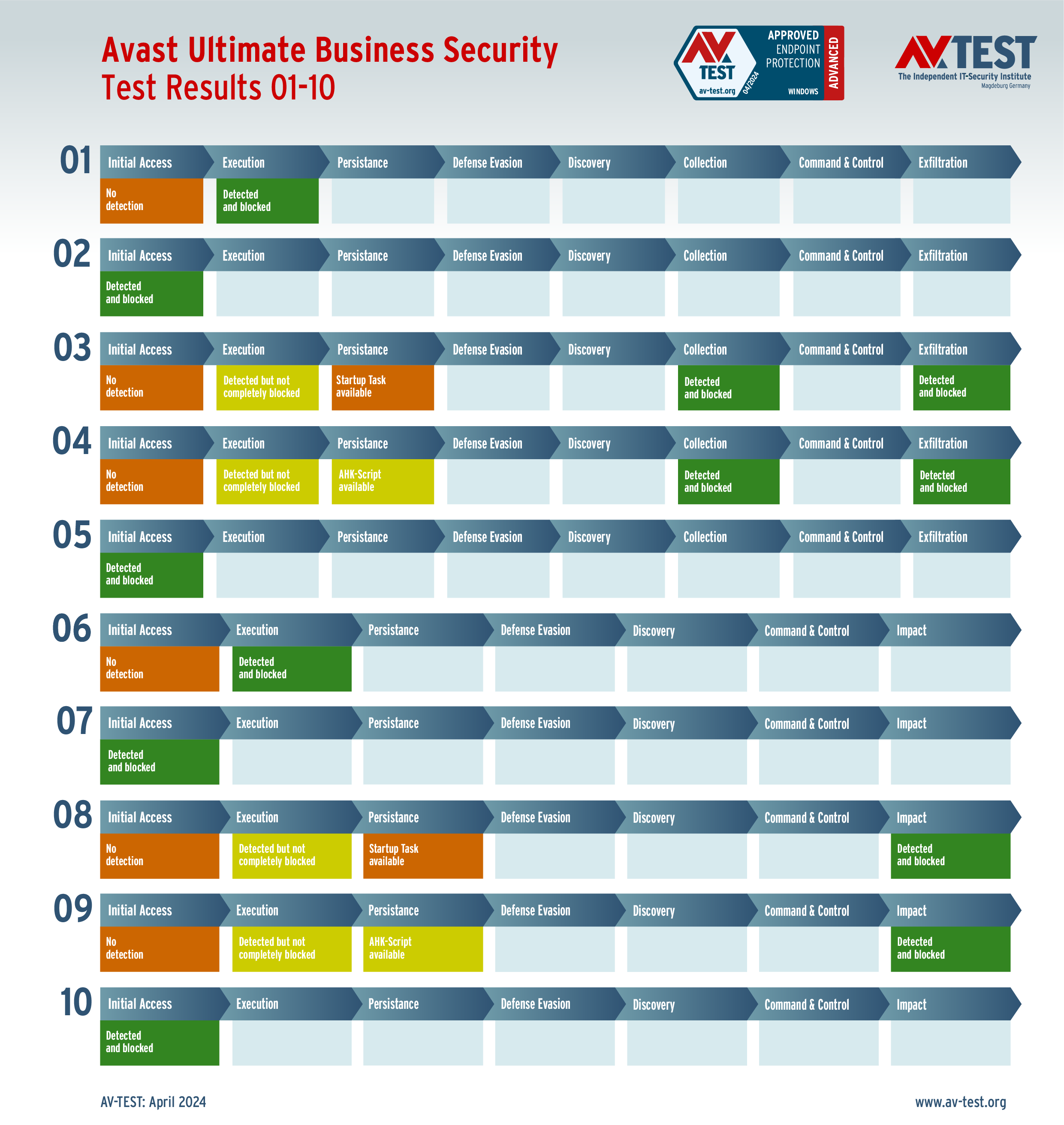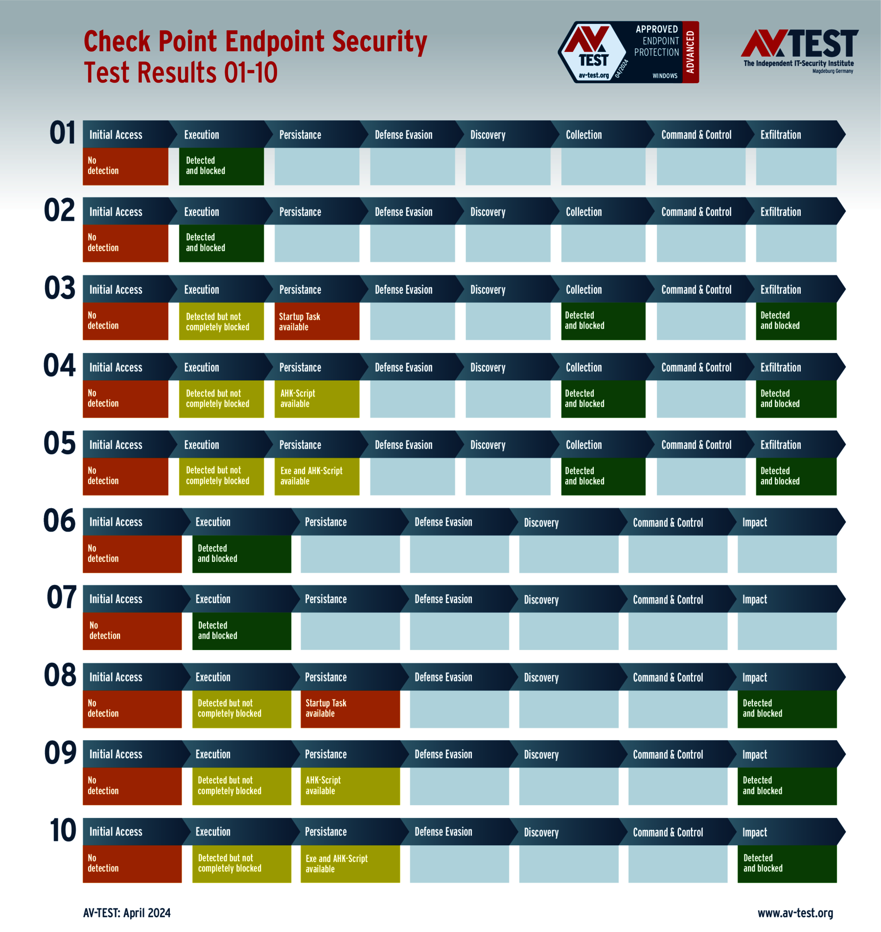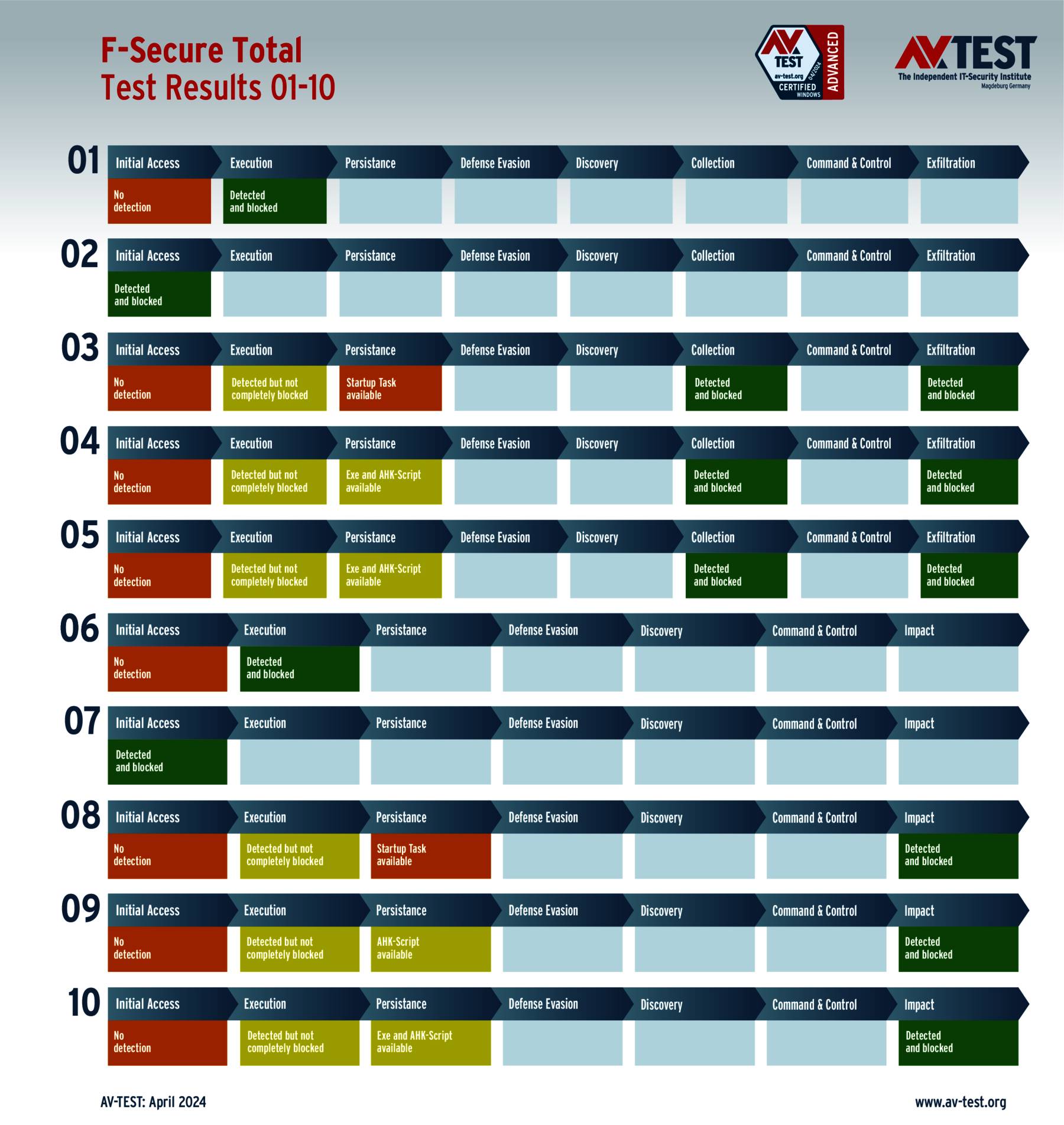 Während klassische Erkennungstest mit Schutzprodukten nur prüfen, ob eine Malware erkannt wird oder nicht, geht der Advanced Threat Protection-Test (ATP) einen wichtigen Schritt weiter. In zehn Szenarien gestalten die Tester Angriffe, die in der Realität genauso pausenlos passieren. Im aktuellen Test versuchen die Experten 5-mal eine Ransomware zu platzieren und 5-mal einen Data Stealer bzw. Infostealer auszuführen. Dazu nutzen sie folgende Angriffstechniken zum Tarnen und Täuschen bei ihren Attacken: