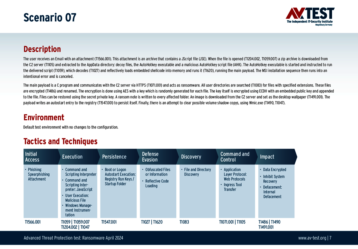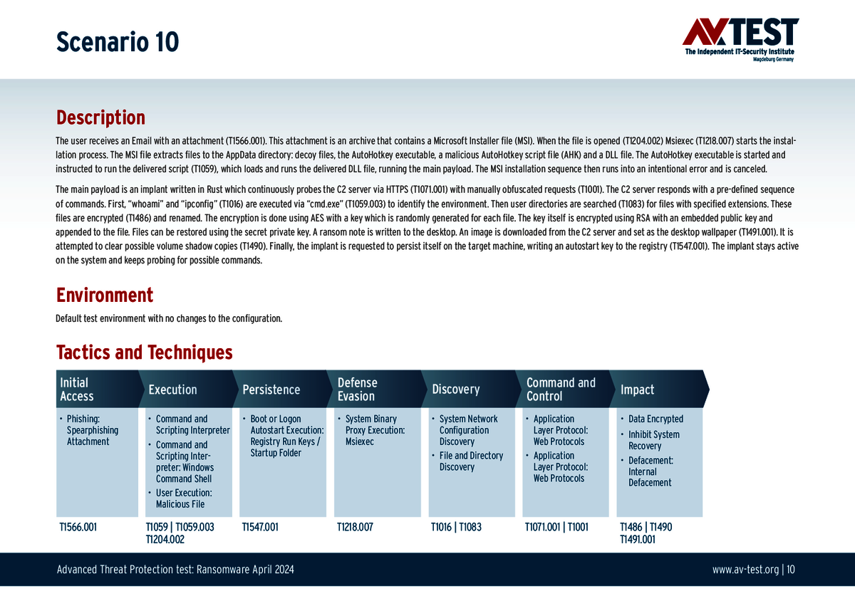 Bring A Scripting Interpreter: Angreifer versuchen oft Skript-Interpreter wie WScript oder PowerShell zu nutzen, um schädliche Skripte auszuführen. Allerdings wissen das viele Schutzprogramme und überwachen entsprechend die Interpreter, sowie deren Ein- und Ausgaben. Eine neue Variante ist der Angriff mit harmlosen Software-Interpretern, wie etwa AutoHotkey (AHK). Ein Skript installiert den Interpreter und führt dann ein AHK-Skript aus, welches eine Ransomware oder einen Infostealer in das Windows-System einspielt. Genau diese Angriffsvariante wurde auch in den Testszenarien eingesetzt.