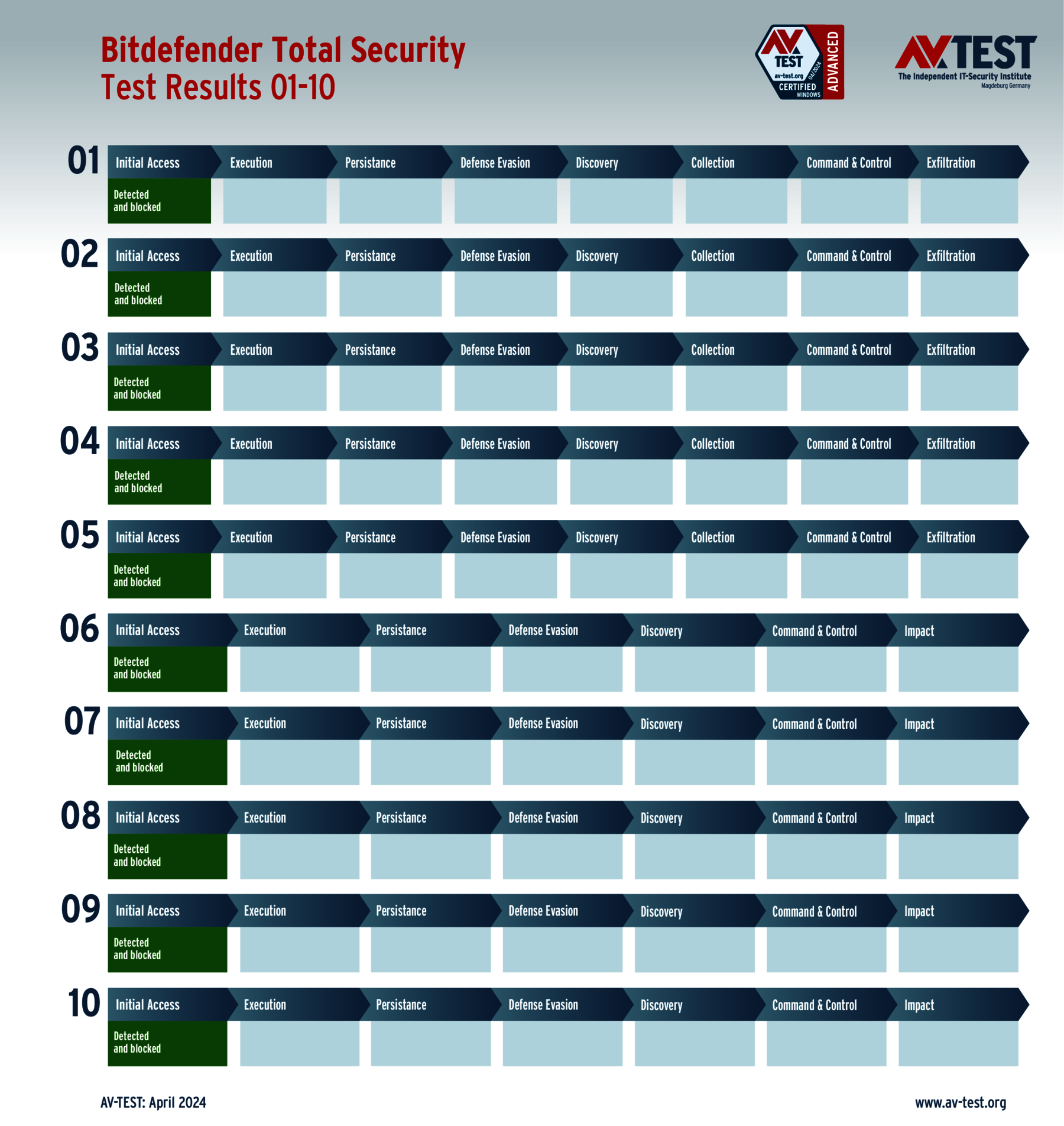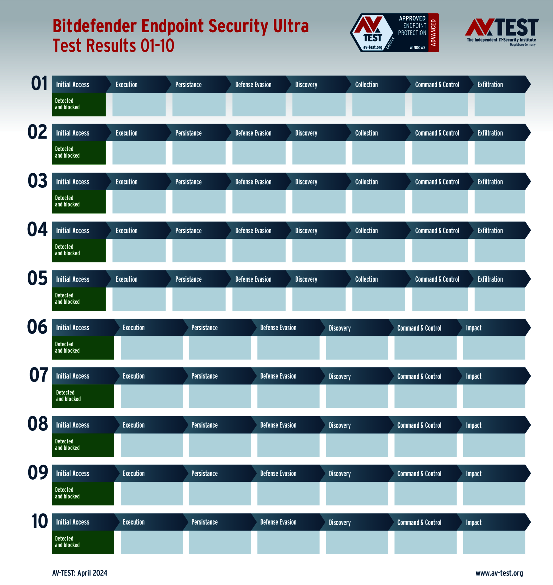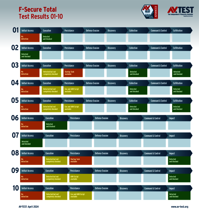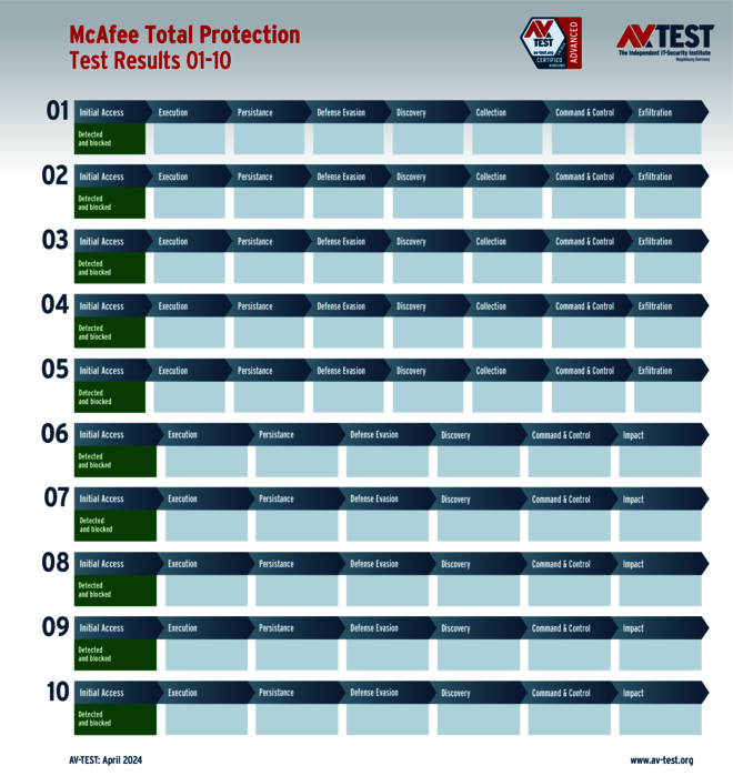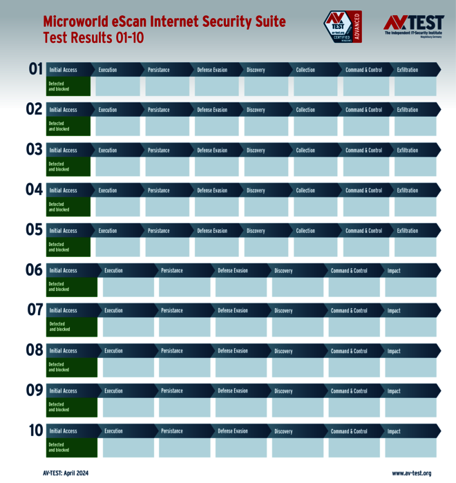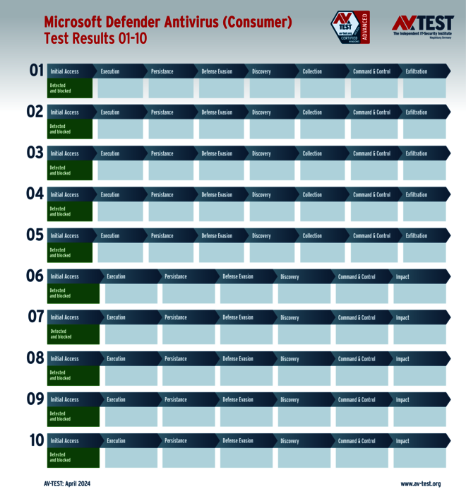 Sehr interessant in diesem Test ist die Tatsache, dass alle Produkte für private Anwender die Angreifer ausnahmslos erkennen. Allerdings können nur 7 der 11 Produkte die gesamte Malware in den ersten Schritten „Initial Access“ oder „Execution“ aufhalten und erhalten die vollen 35 Punkte für ihren Schutz-Score: Bitdefender, G DATA, McAfee, Microsoft, Microworld, Norton und PC Matic.