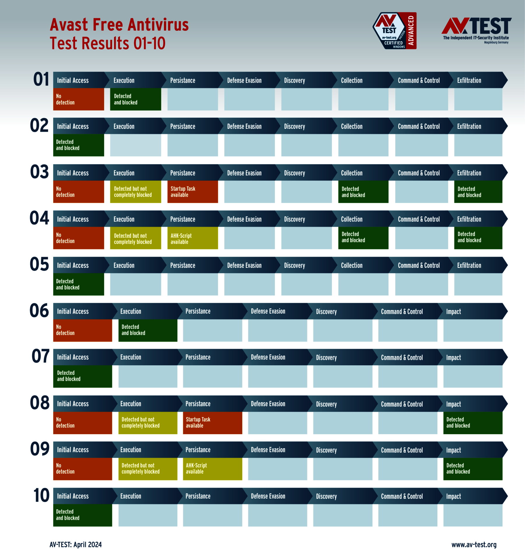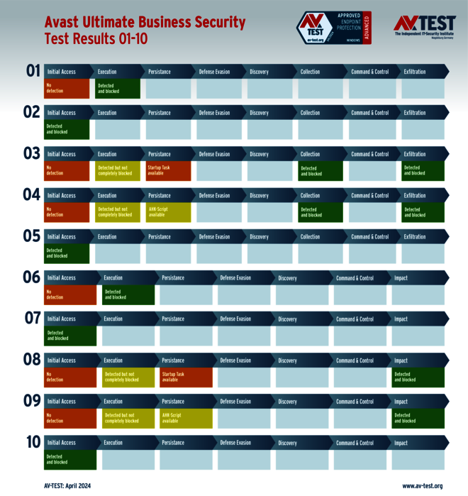 Das Produkt von Avast erkennt zwar alle 10 Angriffe, kann aber in je 2 Fällen die Ransomware und die Data Stealer zunächst nicht stoppen. Erst in den nachgelagerten Schritten werden die Angriffe durch interne Schutztechniken gestoppt und es entsteht kein Schaden. Für das durchbrechen der ersten Abwehrmauern bleiben nach Punktabzügen 30 von 35 Punkten für den Schutz-Score.