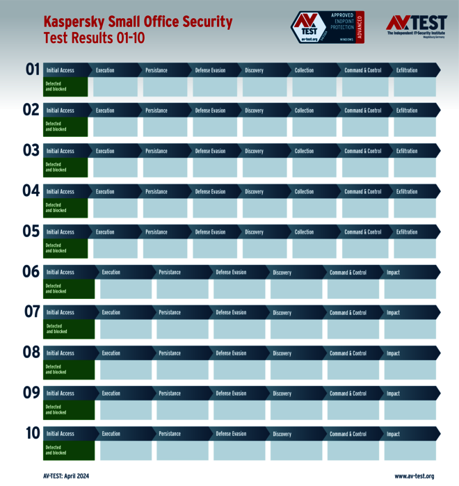 Im ATP-Test werden alle Erkennungs- und Verteidigungsschritte in einer Matrix nach dem MITRE ATT&CK-Standard aufgezeichnet. Bei Ransomware gilt es drei wesentliche Schritte zu erkennen, bei Data bzw. Infostealern sind es vier Aktionen. Pro abgewehrtem Schritt bzw. Aktion vergibt das Labor einen halben oder ganzen Punkt. Damit kann ein Produkt für jede erkannte und liquidierte Ransomware fünfmal 3 Punkte erhalten, für die Infostealer sind es fünfmal 4 Punkte. Somit liegt der Bestwert im Schutz-Score bei 35 Punkten.