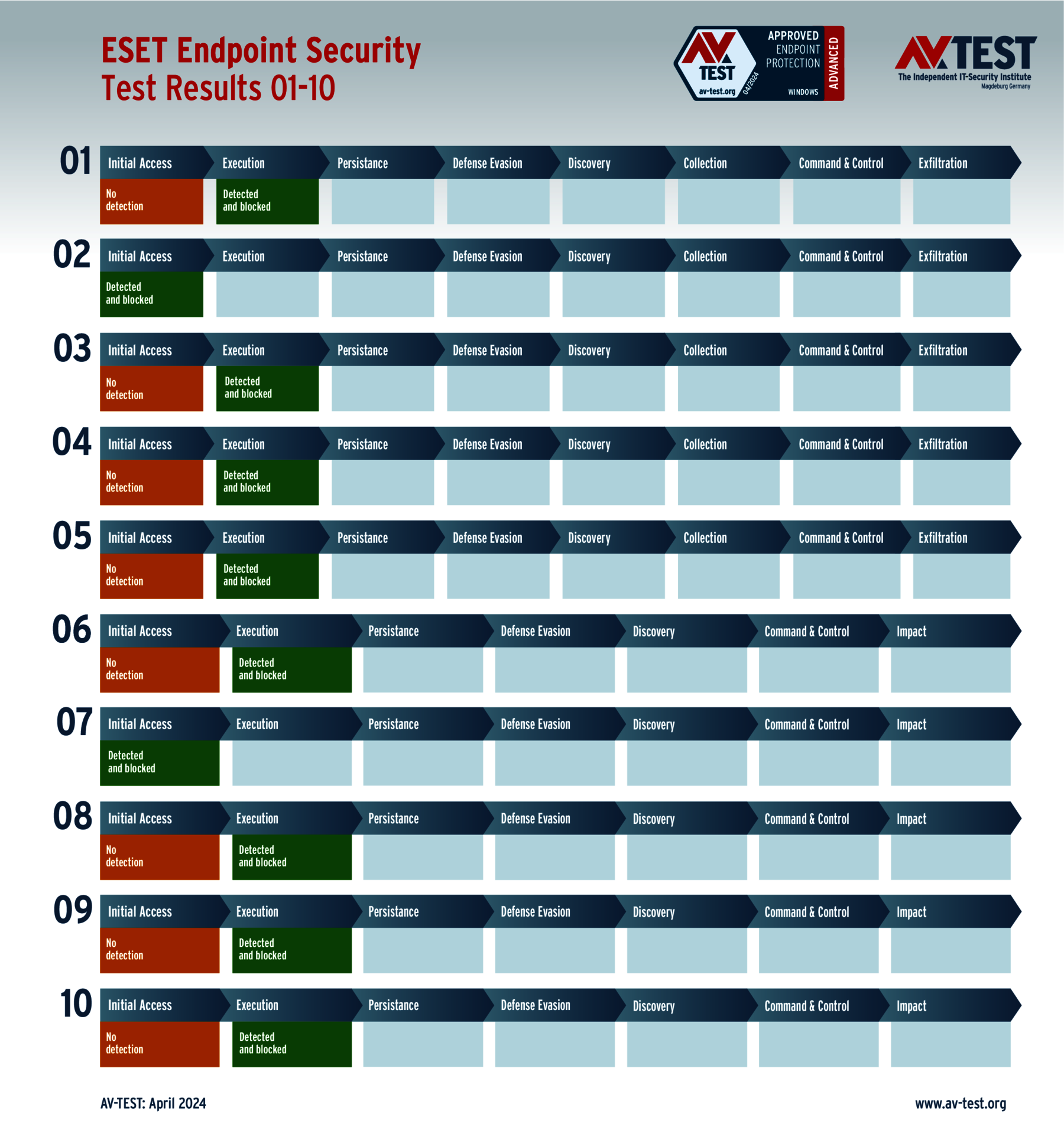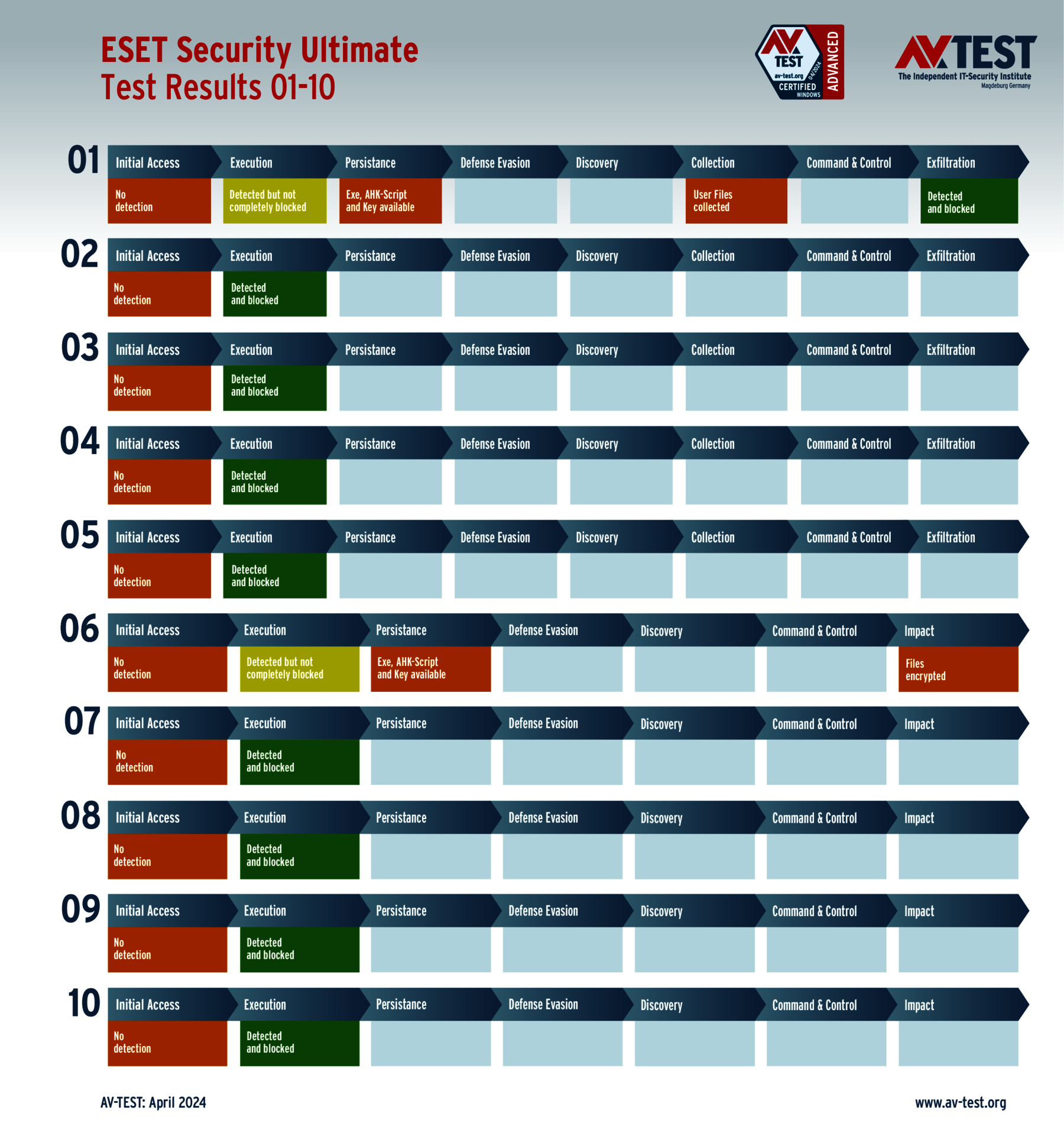 Geprüft wurden 21 Produkte in jeweils 10 Szenarien. In 209 von 210 Fällen gab es keinen Schaden durch eine Malware. Während die Mehrheit der Produkte für Privatanwender und auch viele für Unternehmen die Angreifer erkennen, sofort blocken und liquidieren, machen es einige Produkte unnötig spannend. Aber immerhin können diese Pakete und Lösungen ihre Anfangsfehler schnell ausbügeln und mit weiteren internen Schutzfunktionen die Angreifer an ihrem destruktiven Handeln hindern. Lediglich bei ESET findet sich der 210. Testfall der nicht gut ausgegangen ist. Am Ende war das Windows-System verschlüsselt.