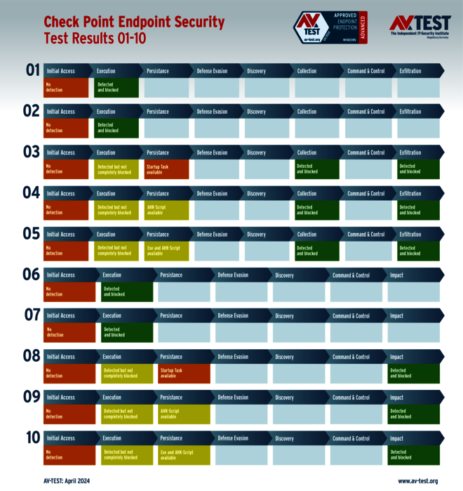 Der Lösung von Check Point ergeht es ähnlich wie Avast, allerdings in 6 Fällen. Auch hier kann die Lösung mit erweiterten Schutztechniken die Angreifer in den nächsten Schritten aufhalten und es entstehen keine Schäden. Natürlich setzt das Labor für die Fälle einen Punkteabzug an: Es bleiben für den Schutz-Score noch 28 von 35 Punkten übrig.