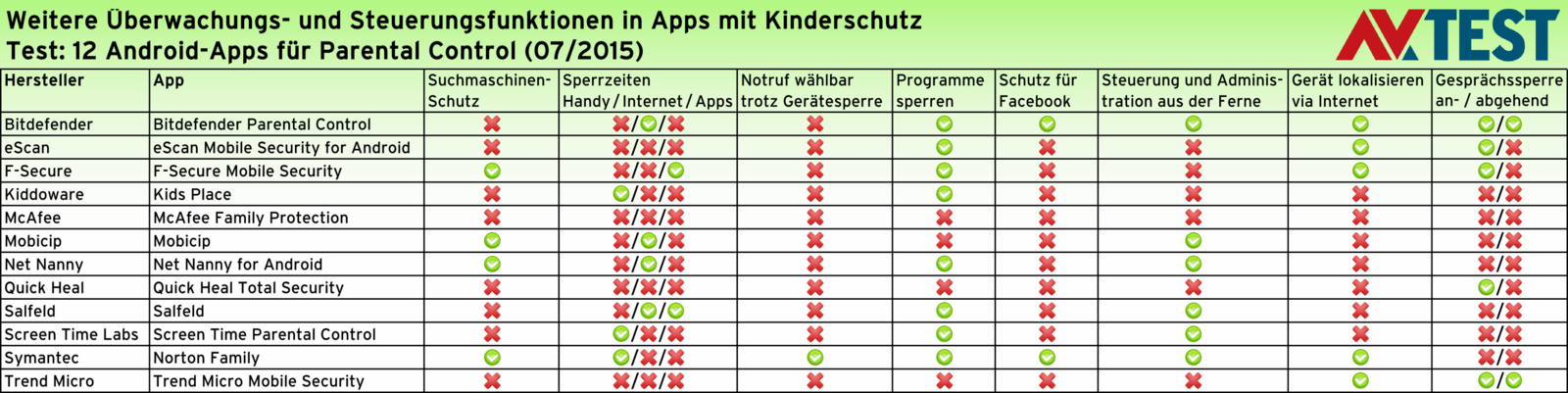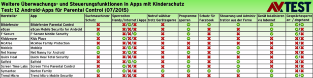 Weiterhin lassen sich mit den mobilen Tools auch Apps sperren, Facebook überwachen und zeitgesteuert an- oder abgehende Gespräche blockieren. Aber auch diese Funktionen stehen nur bei einzelnen Apps teilweise bereit, wie die mitgelieferte Tabelle zeigt.