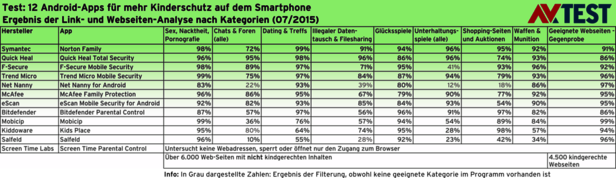 Im Test wurden die Technik bzw. die Auswertungslogik der Apps geprüft. Dazu musste jede App über 6.000 Seiten aussortieren, die definitiv nicht für Kinder geeignet sind. Als Gegenprobe wurden in einem weiteren Testabschnitt 4.500 kindgerechte Webseiten aufgerufen. Die Schwierigkeit dabei ist folgende: eine Märchenseite ist eindeutig für Kinder. Die Webseite eines Autohändlers ist zwar keine Kinderseite, aber dennoch kindgerecht und sollte daher nicht blockiert werden. Die Logik der Apps musste richtig analysieren und aufpassen, dass nicht zu viele Seiten fälschlich gesperrt wurden. Denn ist das ständig der Fall, sind Kinder genervt und versuchen nur noch, den Kinderschutz zu umgehen oder gleich ganz los zu werden. Im Ergebnis fällt auf, dass die Apps, die in den Kategorien recht gut blocken, wie Symantec, Quick Heal oder F-Secure, dafür bei der Gegenprobe zu viele kindgerechte Seiten ebenfalls blocken. Die besten Apps in der Gegenprobe, wie Mobicip, Kiddoware oder Salfeld sind dafür wieder etwas schwächer beim Filtern der Kategorien.