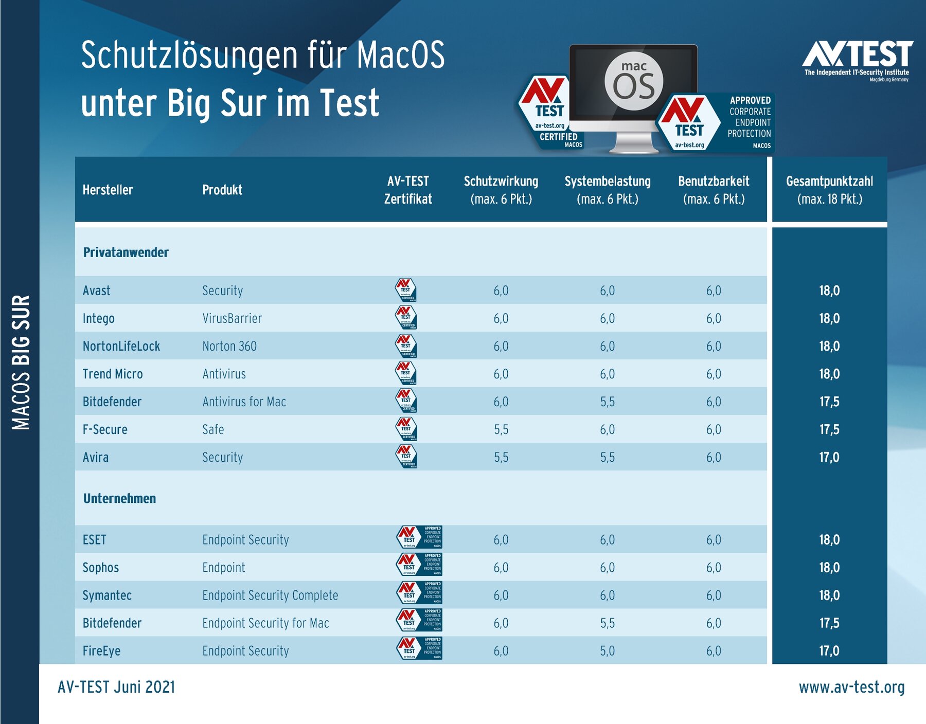 Das Labor hat 7 Schutzpakete für private Nutzer und 5 Lösungen für Mac-Endpoints in Unternehmen untersucht. Als Testplattform dient MacOS Big Sur. Die Schutzpakete für private Nutzer stammen von Avast, Avira, Bitdefender, F-Secure, Intego, NortonLifeLock und Trend Micro.