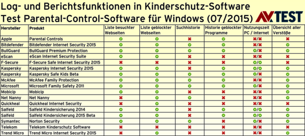 Viele Produkte protokollieren auch die gesamte Suchhistorie, sowie die Liste alle gesperrten Programme, die versucht wurden zu starten. Wer bei seinem Nachwuchs die Nutzungszeit von PC und Internet überwachen will, muss ebenfalls bei vielen Schutz-Tools Abstriche machen. Das können nur F-Secure, Kaspersky (Internet Security) und Salfeld im vollen Umfang. Weitere 4 Produkte notieren entweder die Nutzungszeit des PCs oder die Online-Zeit im Internet. 9 Produkte loggen hier nichts; mit dabei auch 4 reine Kinderschutz-Pakete.