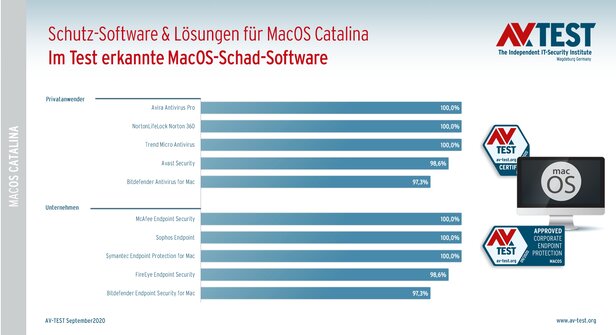 Das Labor von AV-TEST hat im September 2020 Schutzprodukte für private Mac-Nutzer und Lösungen für Unternehmen untersucht. Als Testplattform diente dabei MacOS Catalina in der Version 10.15. Die 5 untersuchten Schutzpakete für Private Nutzer sind von Avast, Avira, Bitdefender, NortonLifeLock und Trend Micro. Die Unternehmenslösungen kommen von Bitdefender, FireEye, McAfee, Sophos und Symantec.