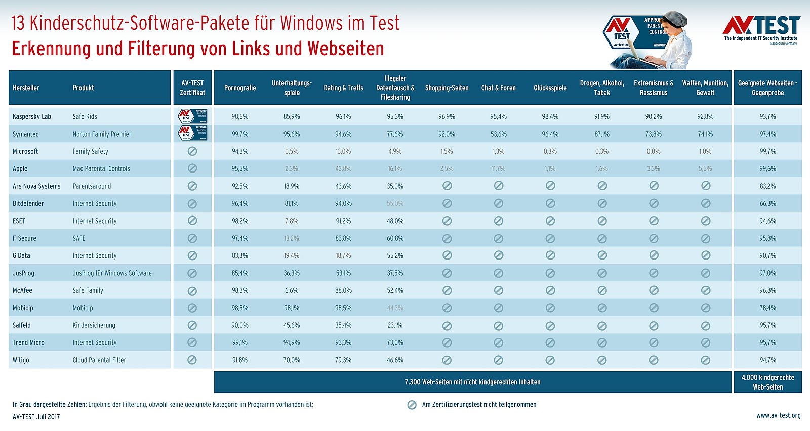 Alle diese Punkte erfüllen die Produkte Kaspersky Safe Kids und Symantec Norton Family Premier und erhalten dafür das Zertifikat “APPROVED Parental Control Windows 07/2017“ von AV-TEST.
