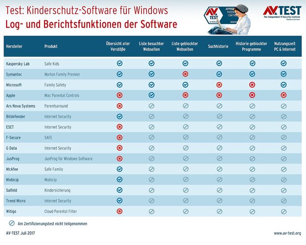 Die Log- und Berichtfunktionen der Kinderschutz-Pakete zeichnen vieles auf, was während der Nutzung des PCs passiert ist: welche Webseiten besucht, gesucht oder geblockt wurden, die Suchhistorie, sowie die Nutzungszeit des PCs und des Internets. Alles zusammen wird dann in einer Berichtsübersicht abgespeichert. Die genannten Punkte erfüllen die Pakete von Kaspersky Lab und Symantec. Die Windows-10 und Mac OS Sierra-internen Tools können das nur teilweise. Bei den anderen Produkten wurde dieser Bereich nicht mitgetestet, da sie nicht am Zertifizierungstest teilgenommen haben. Lediglich ob es eine Übersicht über alle Verstöße gibt, wurde in der Tabelle festgehalten. Dies bieten neben Kaspersky Lab und Symantec die Pakete von Bitdefender, McAfee, Mobicip, Salfeld und Trend Micro.