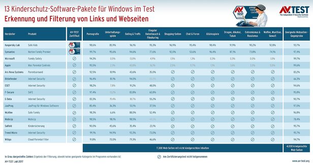 Das Labor von AV-TEST hat in einem umfangreichen Test 13 Kinderschutz-Software-Pakete geprüft. Zusätzlich wurde der gesamte Testumfang auch mit den Windows-10-eigenen Schutzeinstellungen für Kinder durchgeführt. Da einige Schutzlösungen auch unter Mac OS Sierra arbeiten, wurden auch die Mac-internen Schutzeinstellungen für Kinder gecheckt.