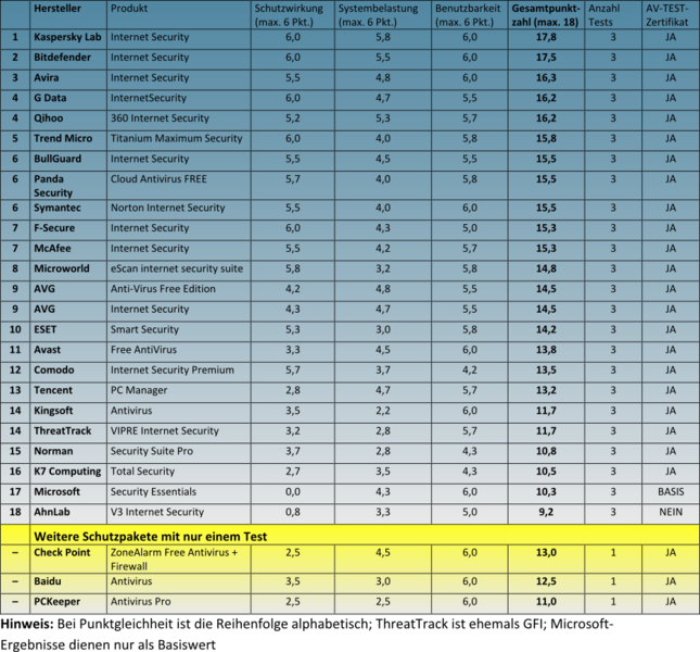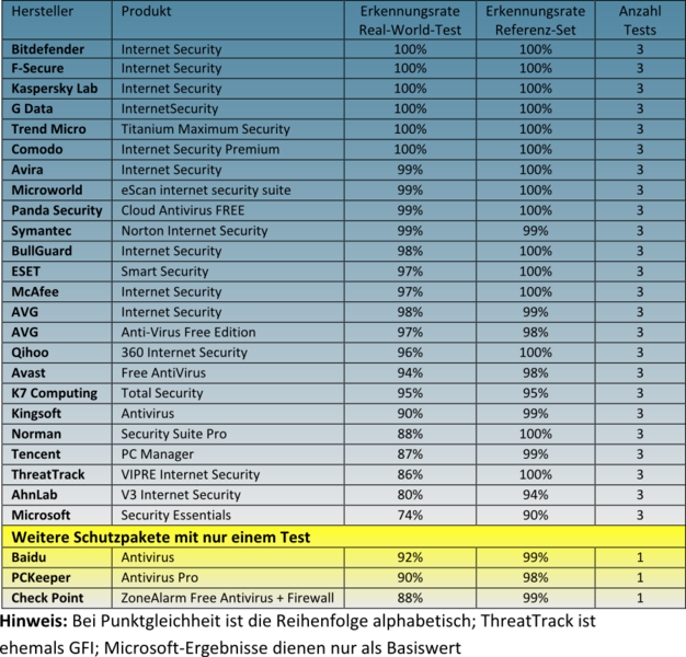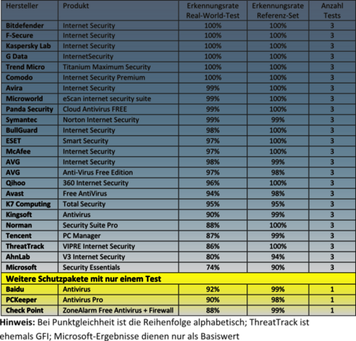 Die Produkte von Baidu, Check Point und PCKeeper nahmen nur in zwei von 6 Testmonaten teil und werden daher in der Tabelle gesondert aufgelistet. Die Ergebnisse der restlichen 24 Pakete inklusive der Vergleichswerte von Microsoft stehen in der Tabelle als Gesamtergebnis.