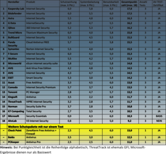 Interessant ist auch der Vergleich zwischen Kauf- und Gratisprodukten: Während die ersten 5 Ränge nur Kaufprodukte belegen, folgt auf einem geteilten sechsten Platz das kostenlose Schutzpaket von Panda Security. Die kostenpflichtige Internet Security von Avira landete zwar auf Rang 3, aber das Ergebnis des Kaufprodukts lässt sich nicht einfach auf die kostenlose Variante von Avira übertragen.