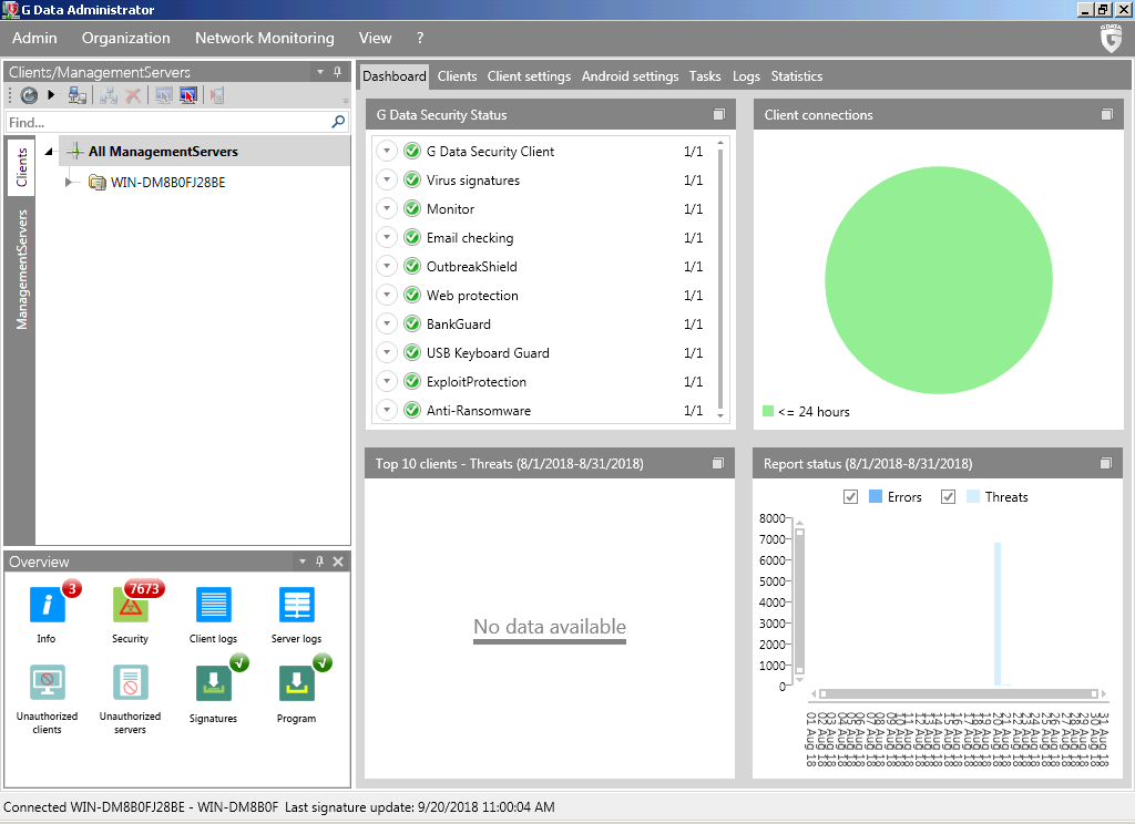 During July and August 2018 we continuously evaluated 18 endpoint protection products using settings as provided by the vendor. We always used the most current publicly-available version of all products for the testing. They were allowed to update themselves at any time and query their in-the-cloud services. We focused on realistic test scenarios and challenged the products against real-world threats. Products had to demonstrate their capabilities using all components and protection layers.