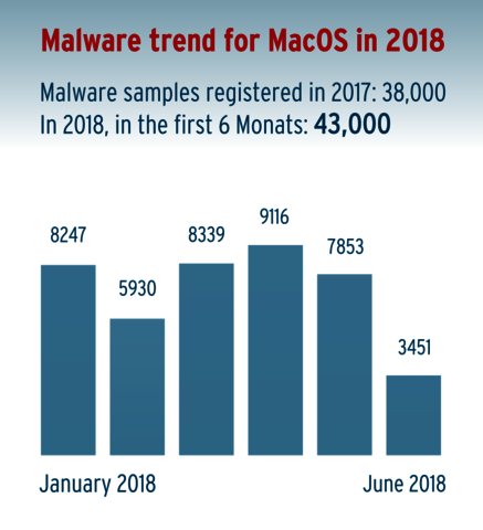 The Mac world is more and more in the focus of malware authors. In June 2018, newly-recorded malware for MacOS has already been tallied at 37,000 samples – and thus approaching the entire 2017 level of 43,000 samples. While this represents fewer cases than in the Windows world, the number is in fact 100 times higher than Mac experts predicted even a few years ago.