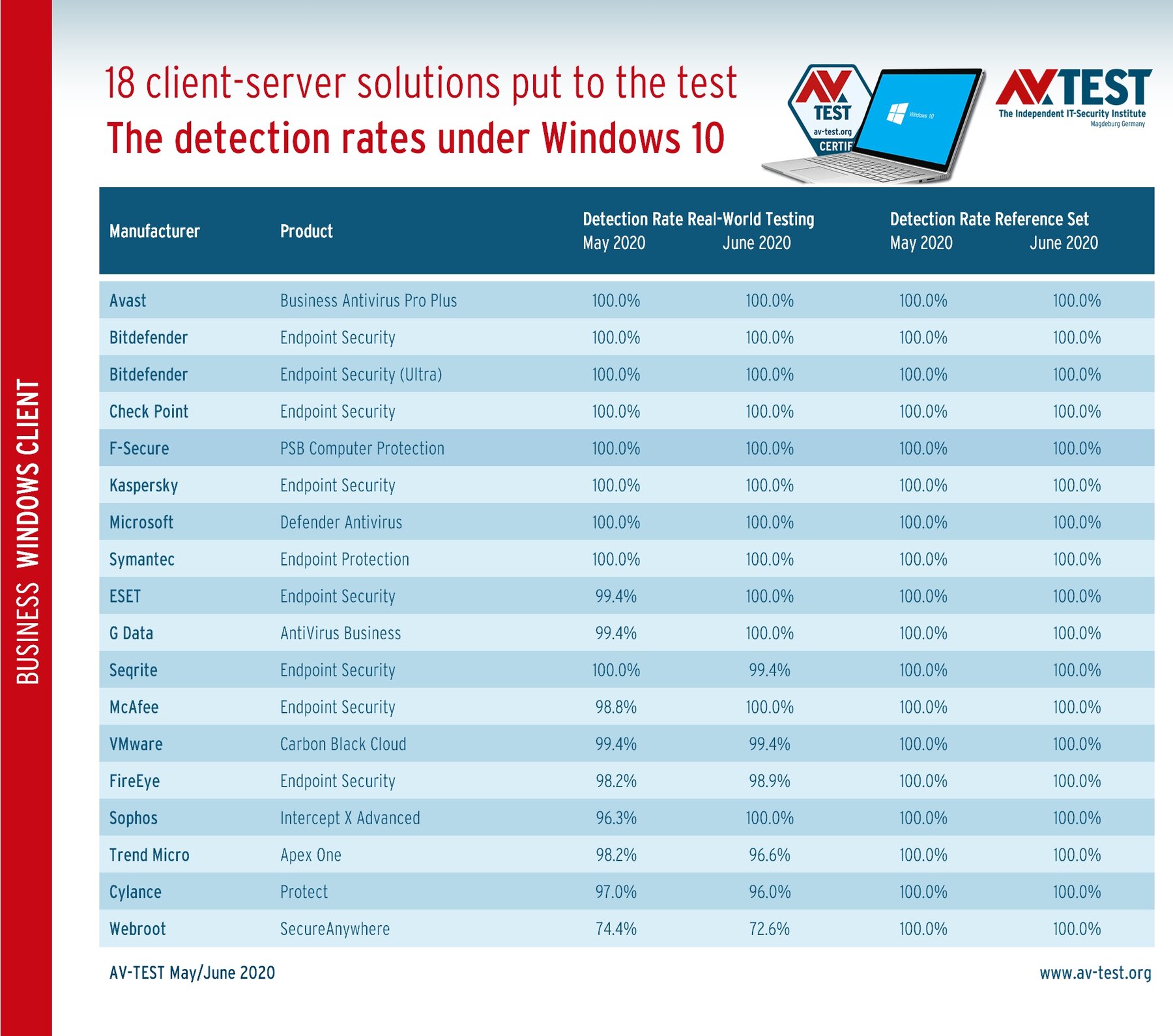 With 18 points, the solutions from F-Secure, Kaspersky, Microsoft, and Symantec shared first place. In hot pursuit at 17.5 points were the corporate products from Avast, Bitdefender (Endpoint Security), G Data, McAfee and Seqrite.