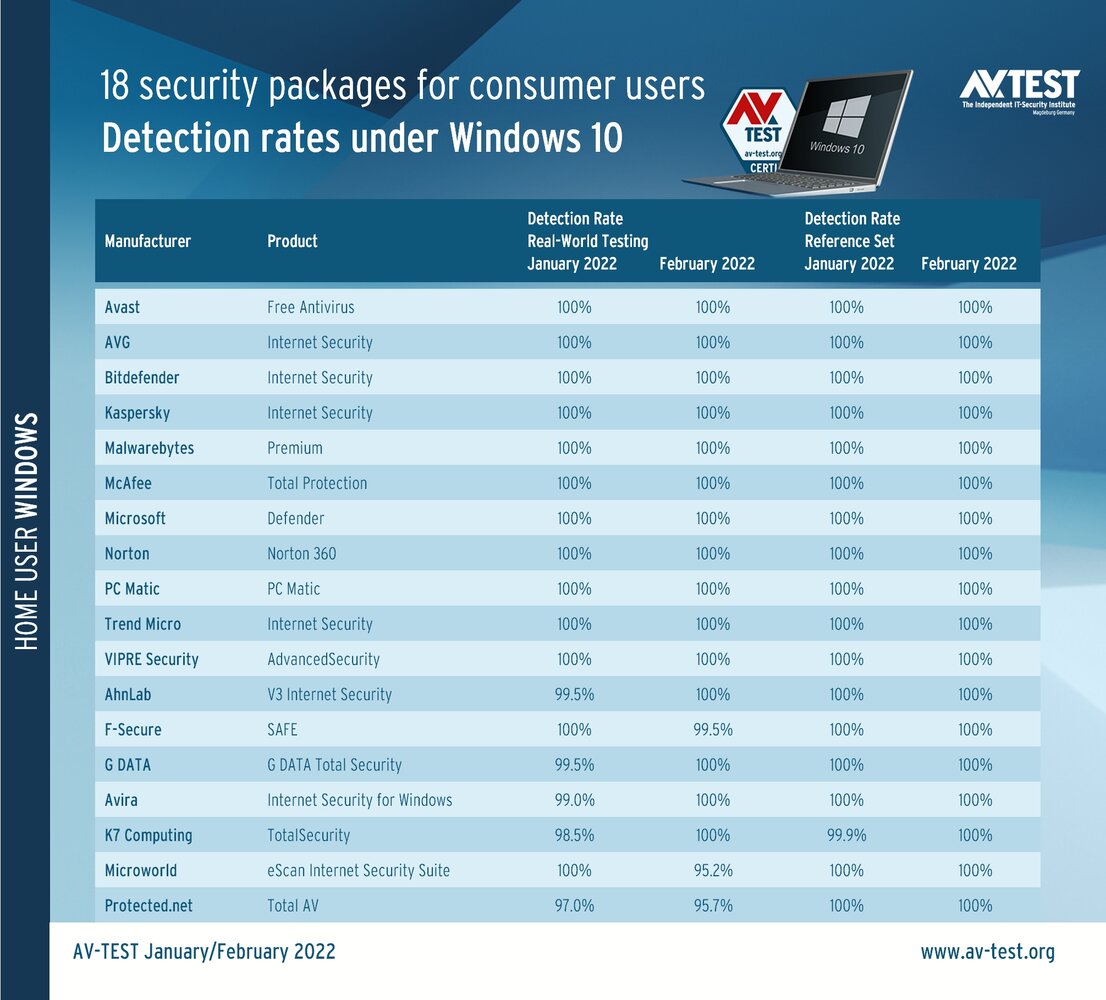 In this test, the lab at AV-TEST evaluated 18 security packages in terms of their protection, performance and usability. The last category primarily involved the test for false alarms. Each product was tested in two successive months, and the results were aggregated. The test with the 18 security products took place in the lab in January and February 2022 under Windows 10. Included in the test were security packages and Internet security suites from AhnLab, Avast, AVG, Avira, Bitdefender, F-Secure, G DATA, K7 Computing, Kaspersky, Malwarebytes, McAfee, Microsoft, Microworld, Norton, PC Matic, Protected.net, Trend Micro and VIPRE Security.
