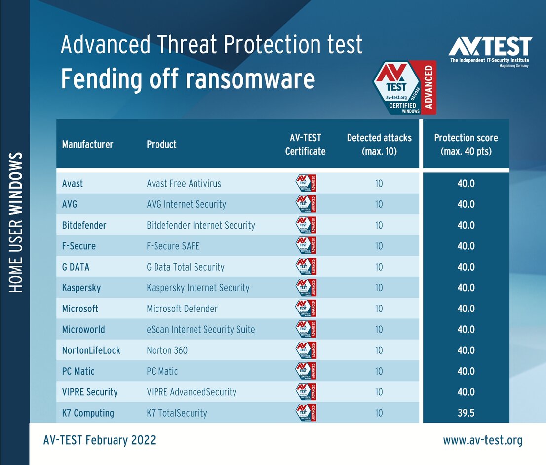 In the current test, 12 consumer products from the following vendors are being subjected to the tests performed by the experts in the lab: Avast, AVG, Bitdefender, F-Secure, G DATA, K7 Computing, Kaspersky, Microsoft, Microworld, NortonLifeLock, PC Matic and VIPRE Security.