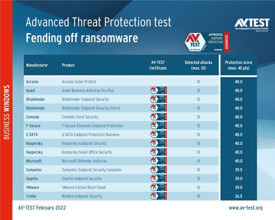 The solutions tested for business users are products from the following vendors: Acronis, Avast, Bitdefender (two versions), Comodo, F-Secure, G DATA, Kaspersky (two versions), Microsoft, Seqrite, Symantec, Trellix and VMware.