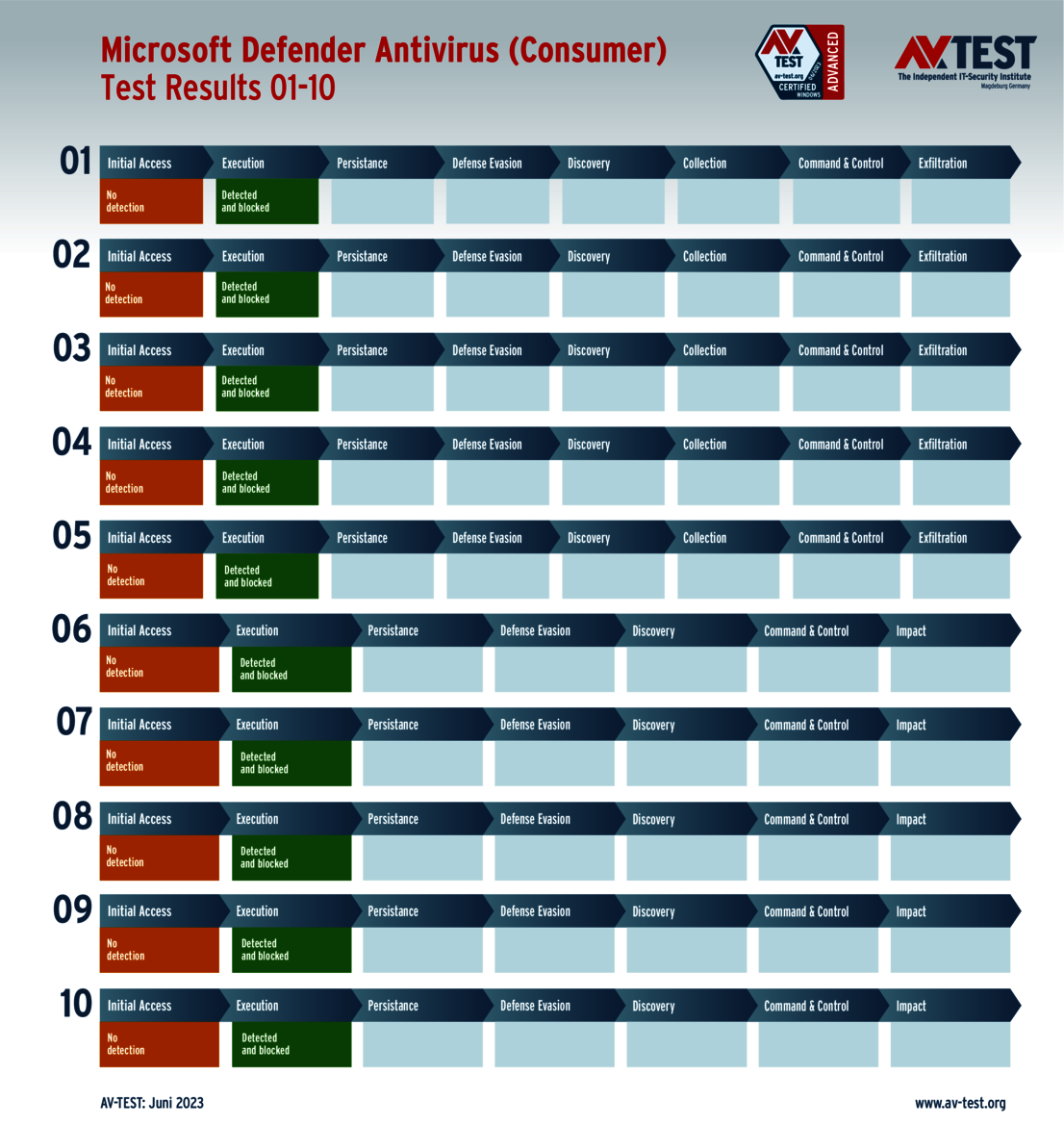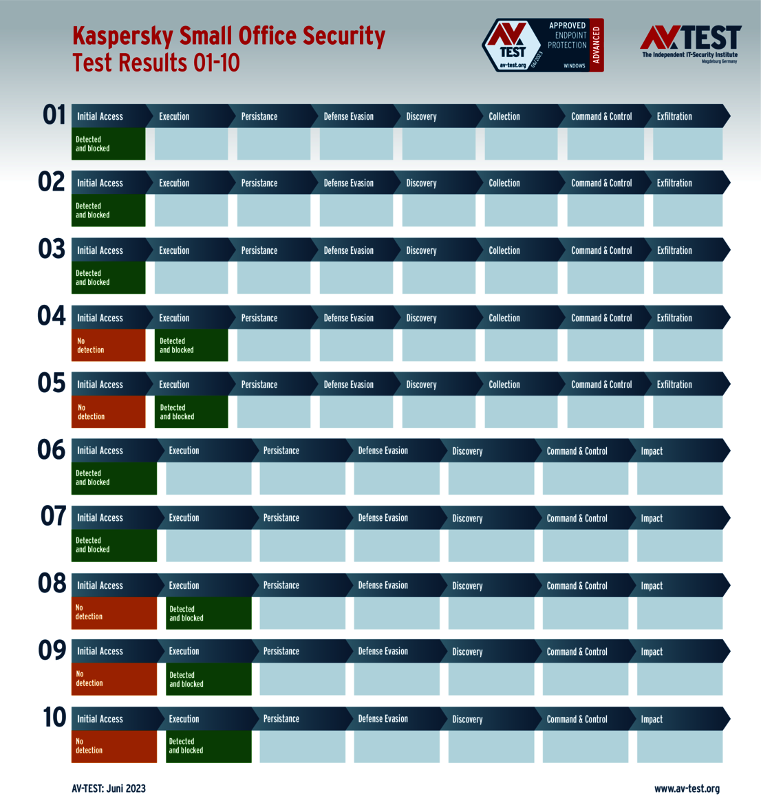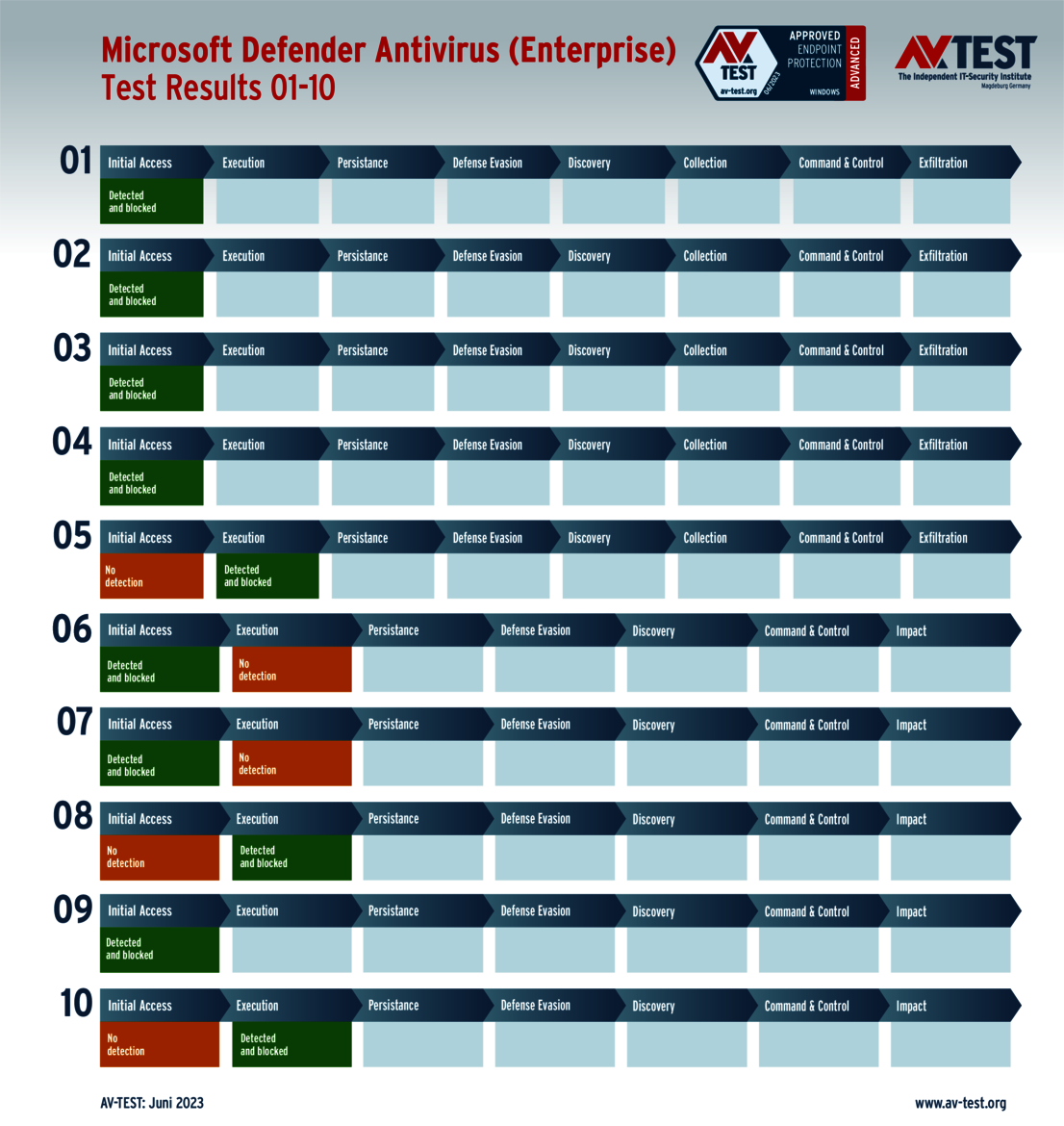 In its May-June test, AV-TEST examined 27 products under laboratory conditions in its Advanced Threat Protection test. In doing so, the experts went far beyond the classic detection test – just as a protection solution does as well. For in addition to basic detection, the products use sophisticated techniques for detection and defense, such as EDR, Endpoint Detection and Response, for example. That is why an attack may be fended off in later steps, although the detection did not trigger in the initial step.