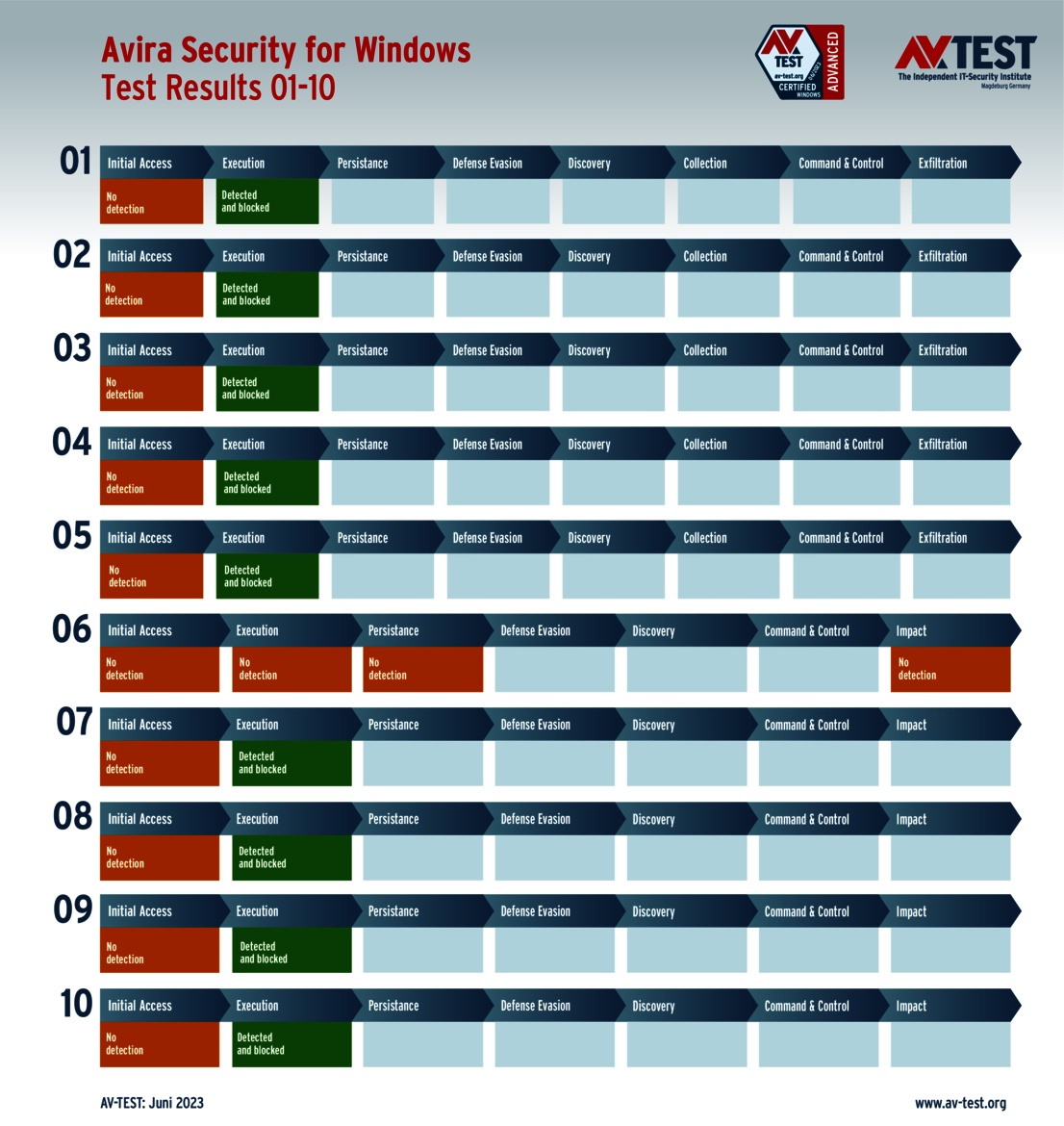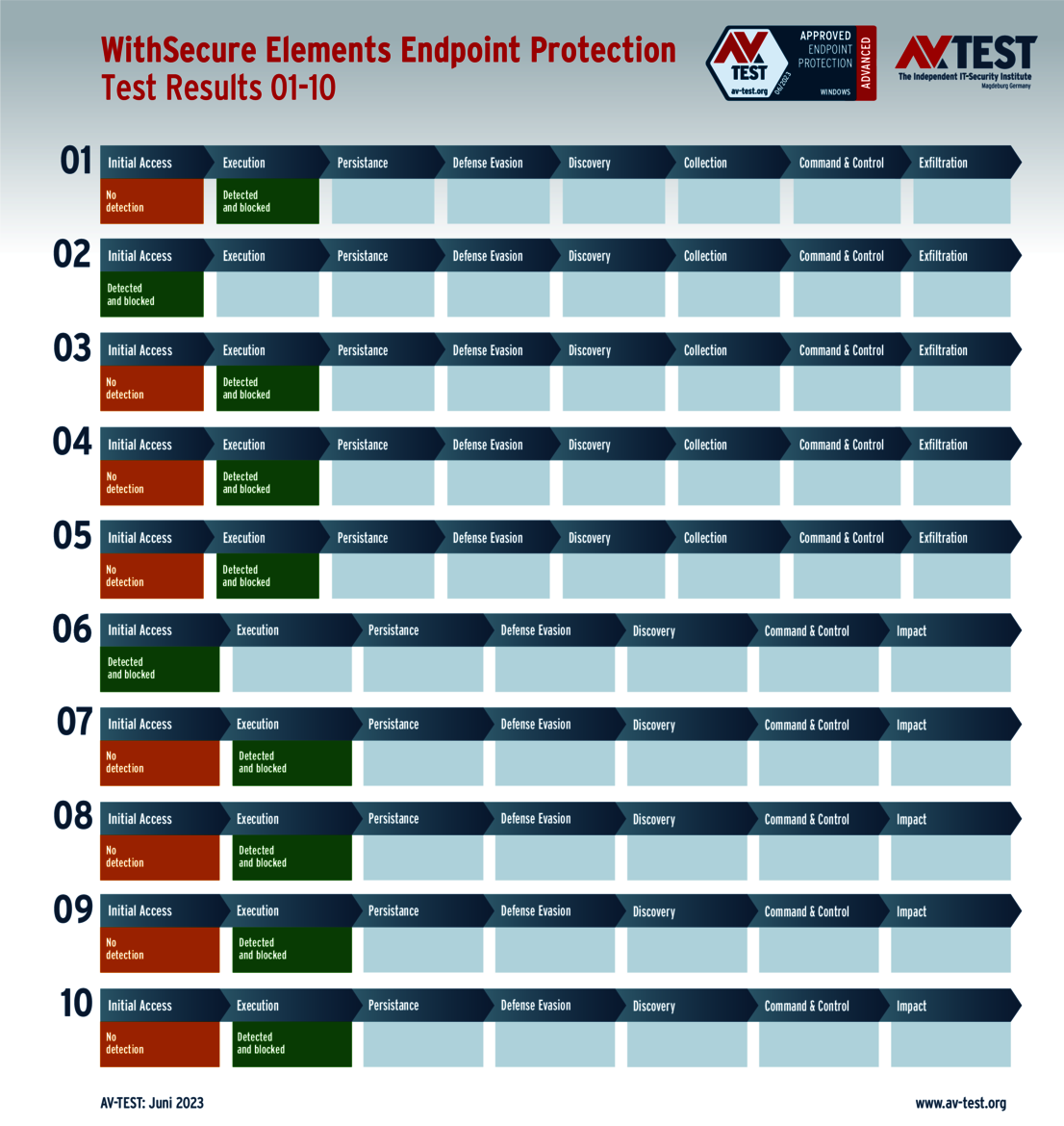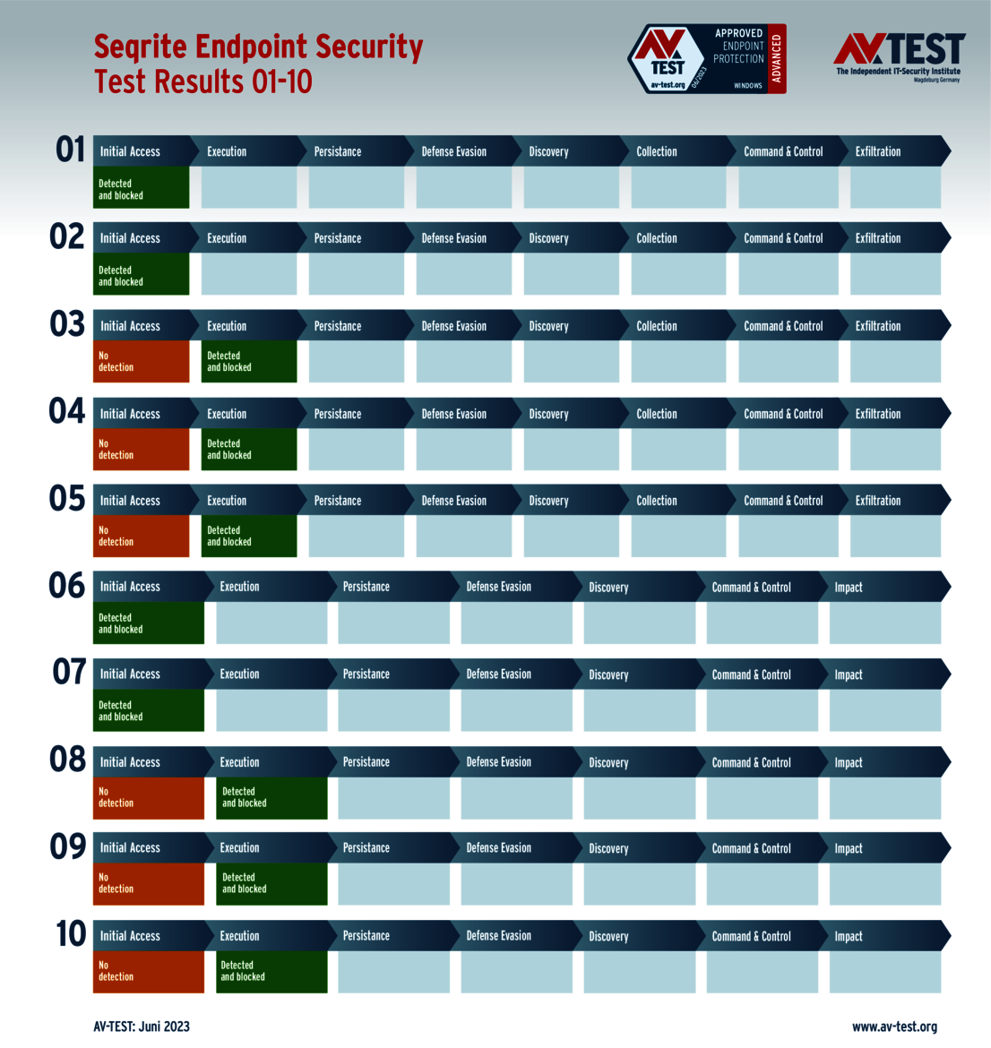 All attack scenarios are documented according to the standard of the MITRE ATT&CK database. The individual sub-techniques, for example "T1566.001", are listed in the MITRE database for "Techniques" under "Phishing: Spearphishing Attachment". Each test step is thus defined among the experts and can be logically understood. In addition, all attack techniques are explained, along with how successful the malware is.
