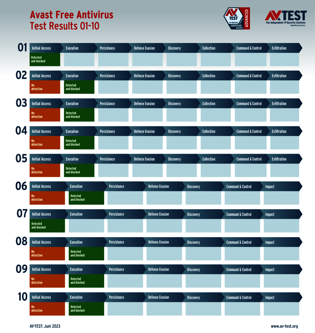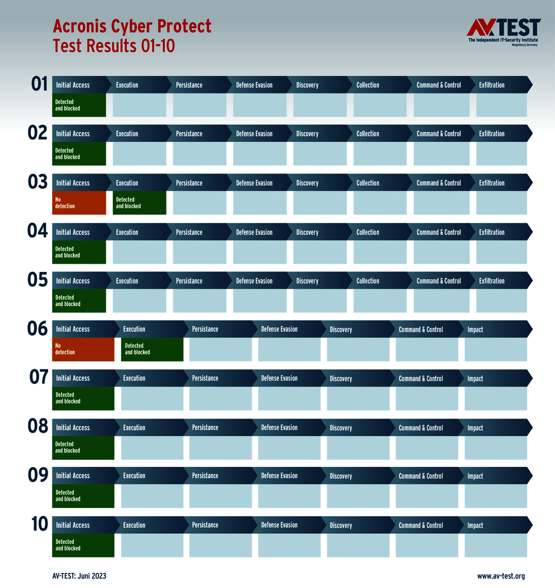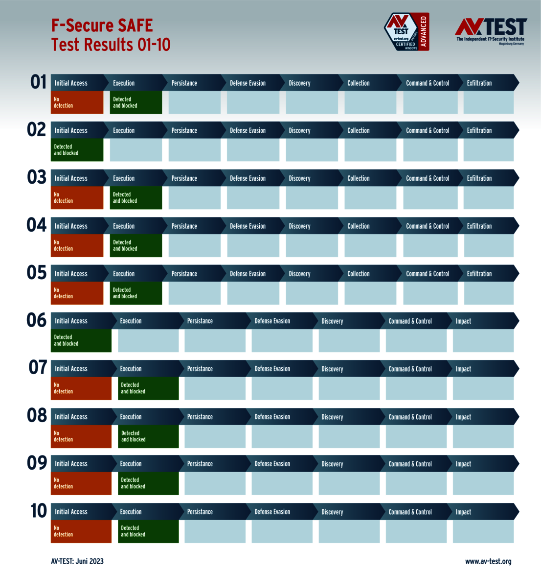 All attack scenarios are documented according to the standard of the MITRE ATT&CK database. The individual sub-techniques, for example "T1566.001", are listed in the MITRE database for "Techniques" under "Phishing: Spearphishing Attachment". Each test step is thus defined among the experts and can be logically understood. In addition, all attack techniques are explained, along with how successful the malware is.