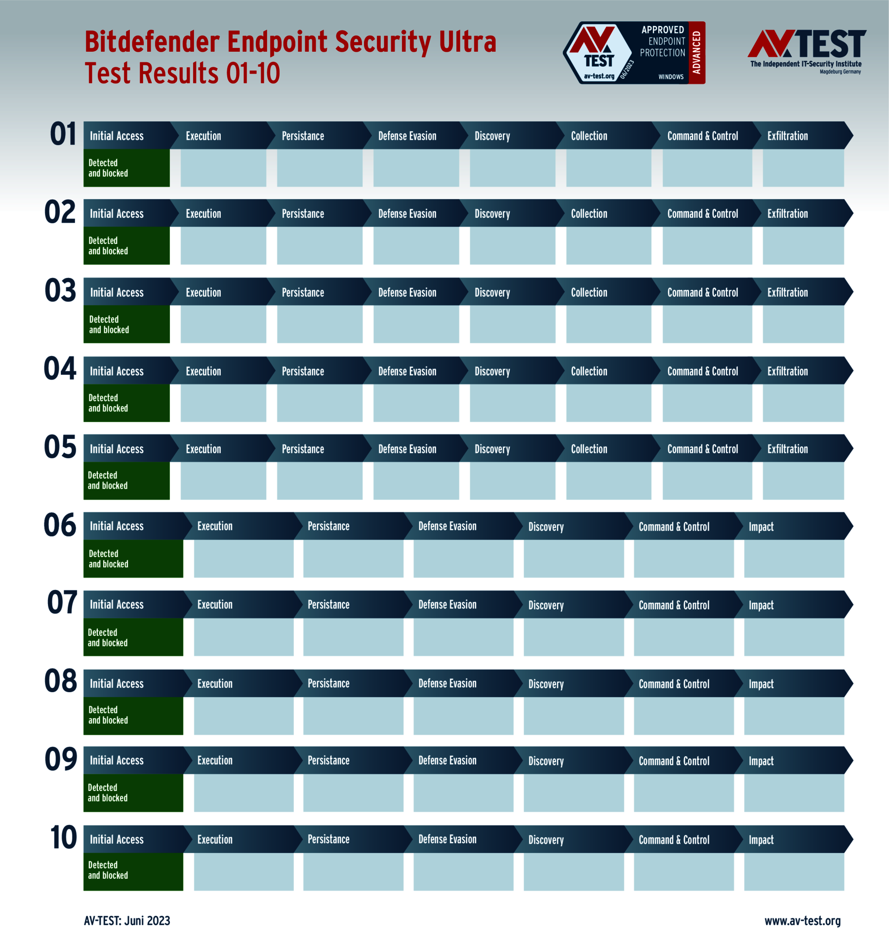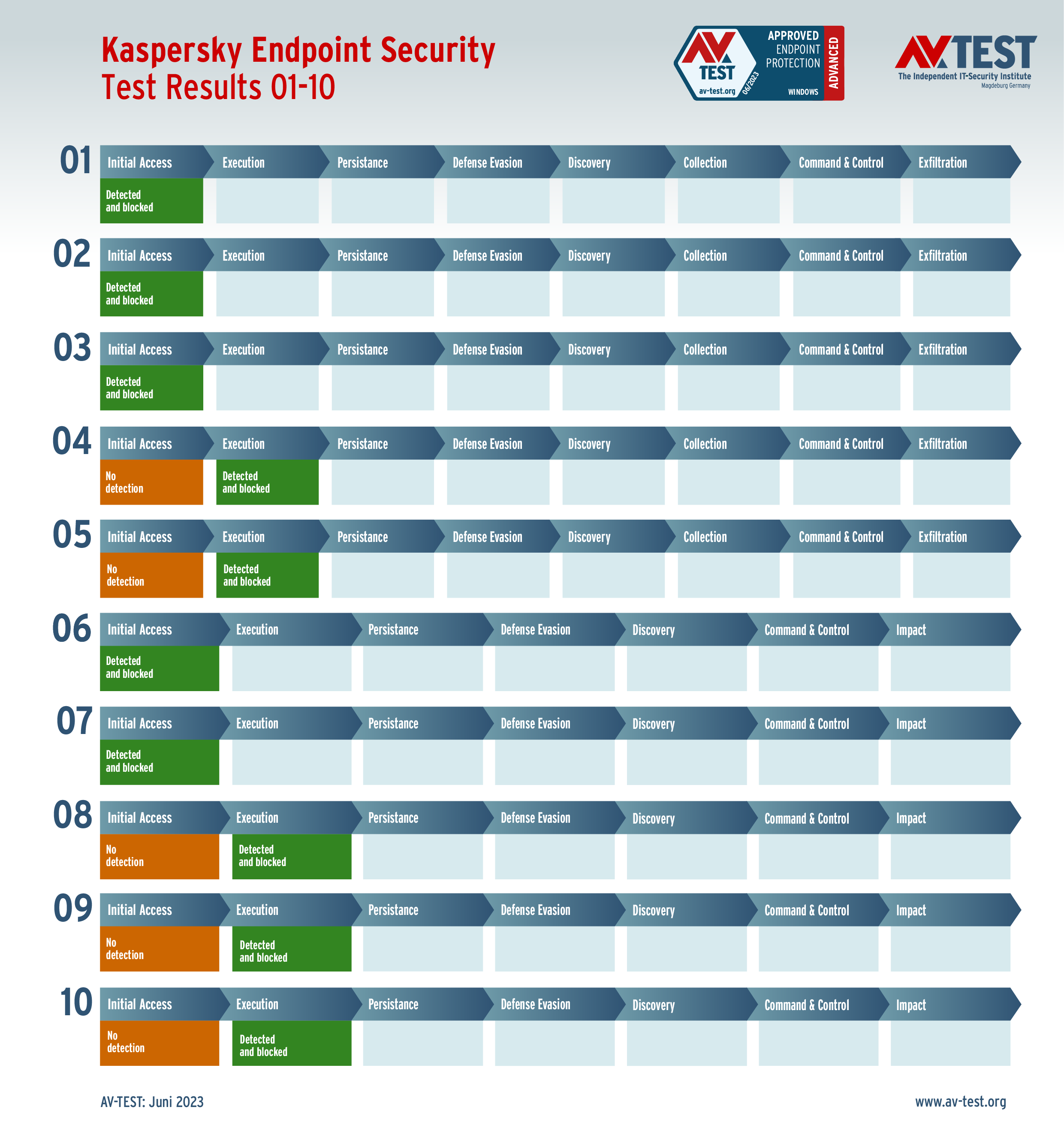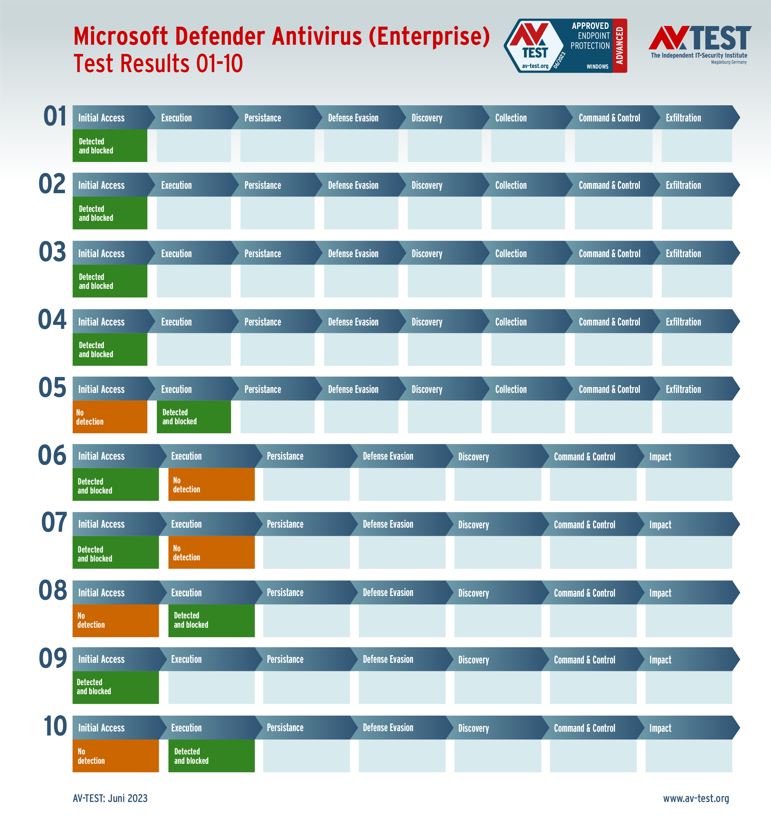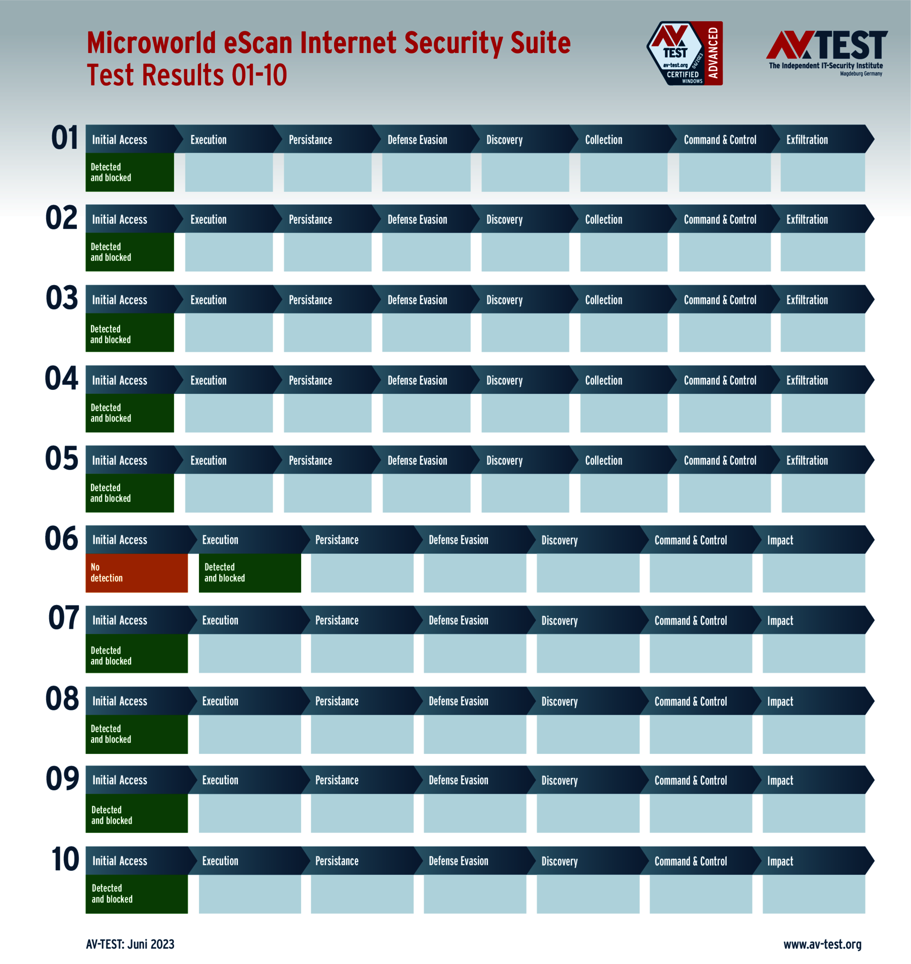 In its May-June test, AV-TEST examined 27 products under laboratory conditions in its Advanced Threat Protection test. In doing so, the experts went far beyond the classic detection test – just as a protection solution does as well. For in addition to basic detection, the products use sophisticated techniques for detection and defense, such as EDR, Endpoint Detection and Response, for example. That is why an attack may be fended off in later steps, although the detection did not trigger in the initial step.