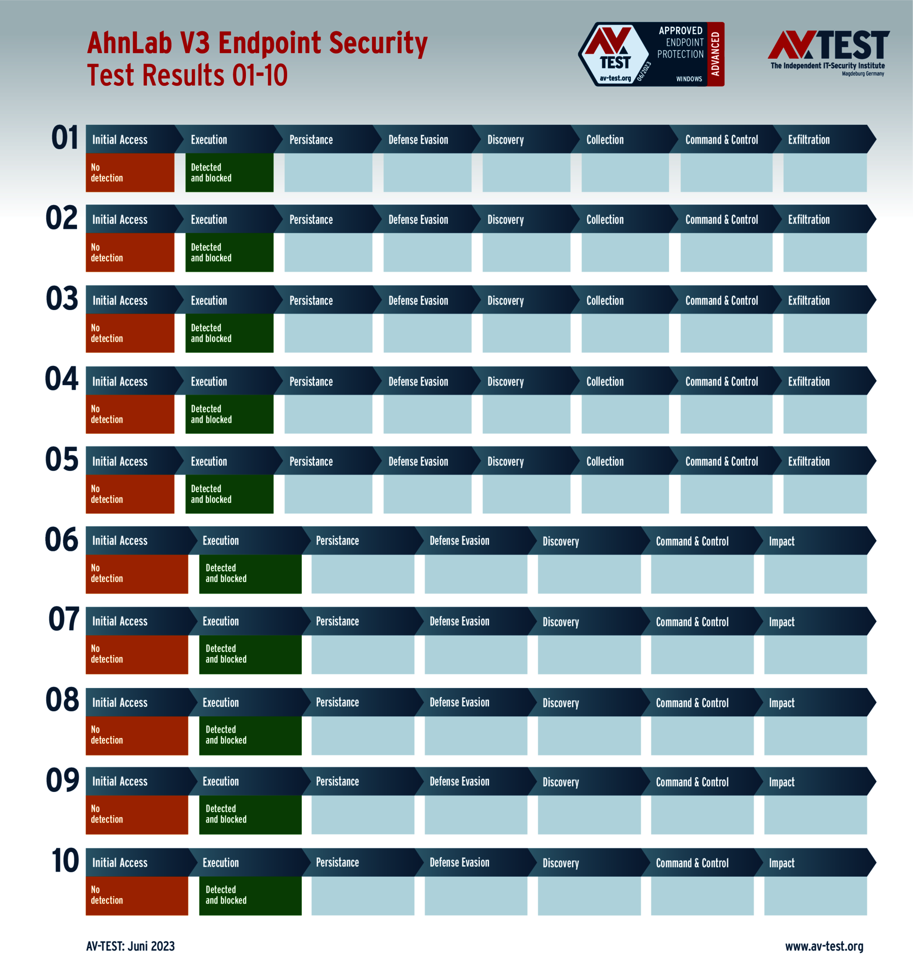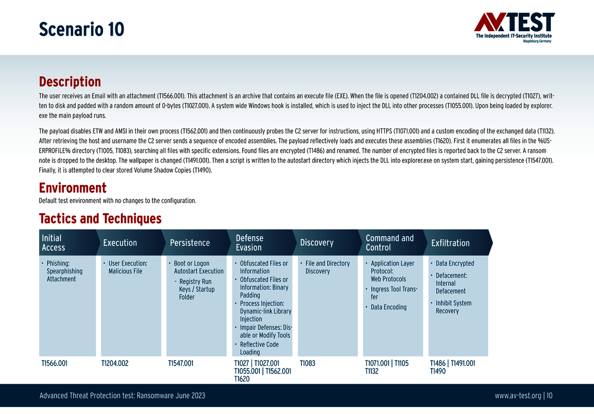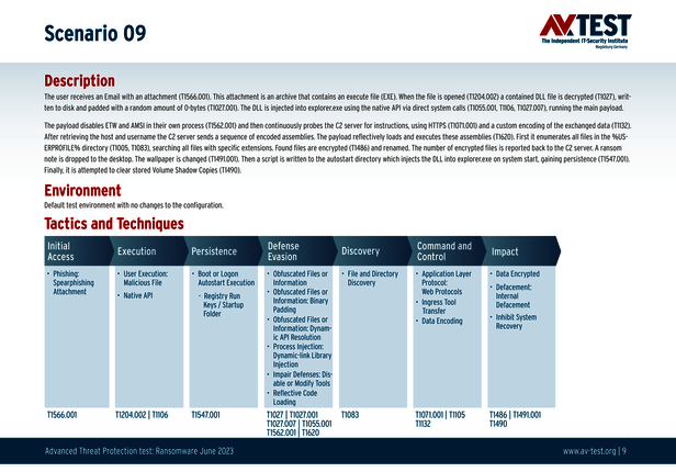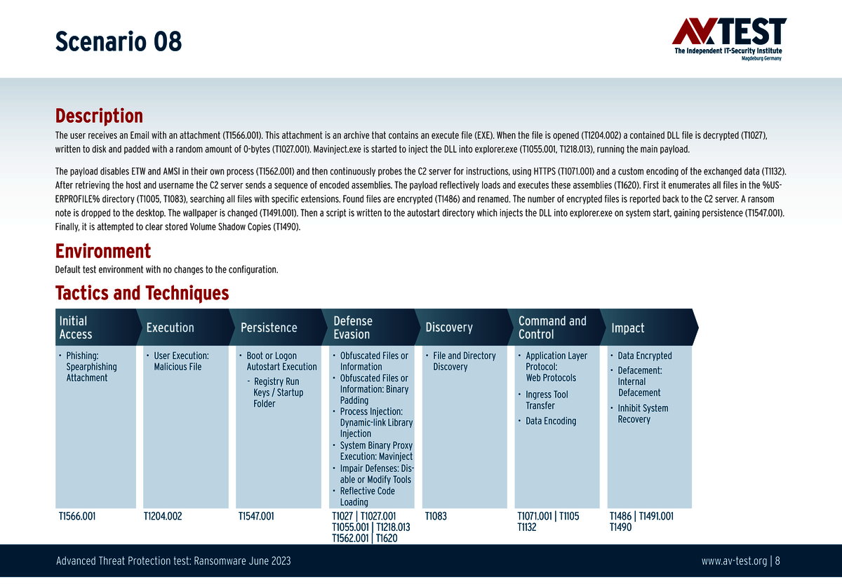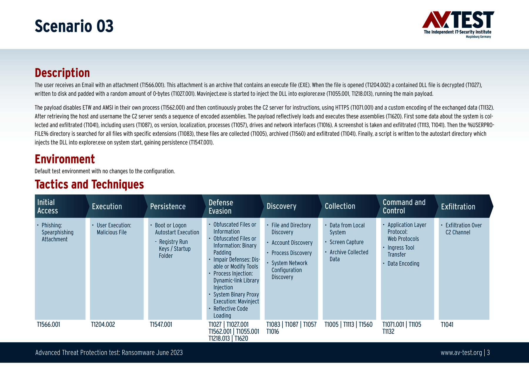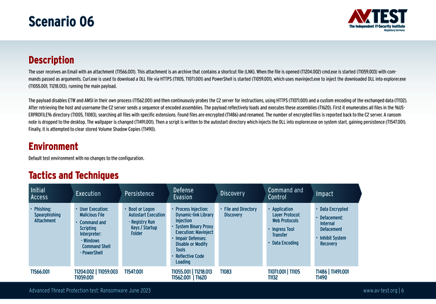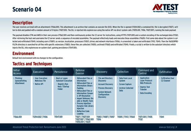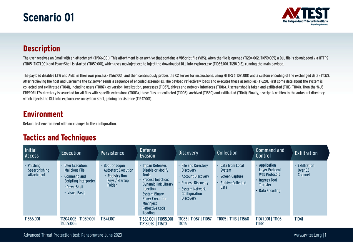 All attack scenarios are documented according to the standard of the MITRE ATT&CK database. The individual sub-techniques, for example "T1566.001", are listed in the MITRE database for "Techniques" under "Phishing: Spearphishing Attachment". Each test step is thus defined among the experts and can be logically understood. In addition, all attack techniques are explained, along with how successful the malware is.