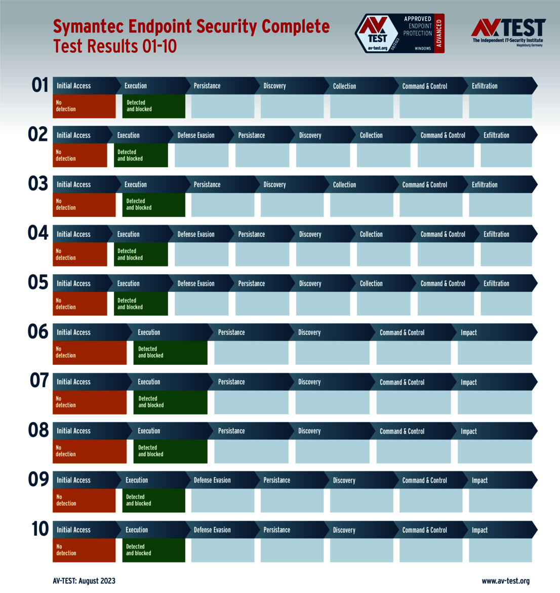 The sequence of an attack in the Advanced Threat Protection test usually follows this pattern: a spearphishing e-mail, containing a malware attachment, ends up in a Windows system. This is where the protection systems detect the attacker immediately or as soon as it starts running. In the results chart, this is confirmed with the green field under "Initial Access“ or under "Execution". If that is the case, then the attack is already thwarted.