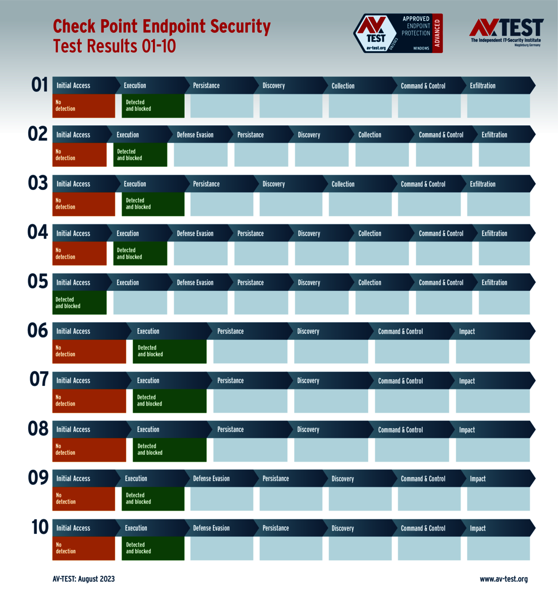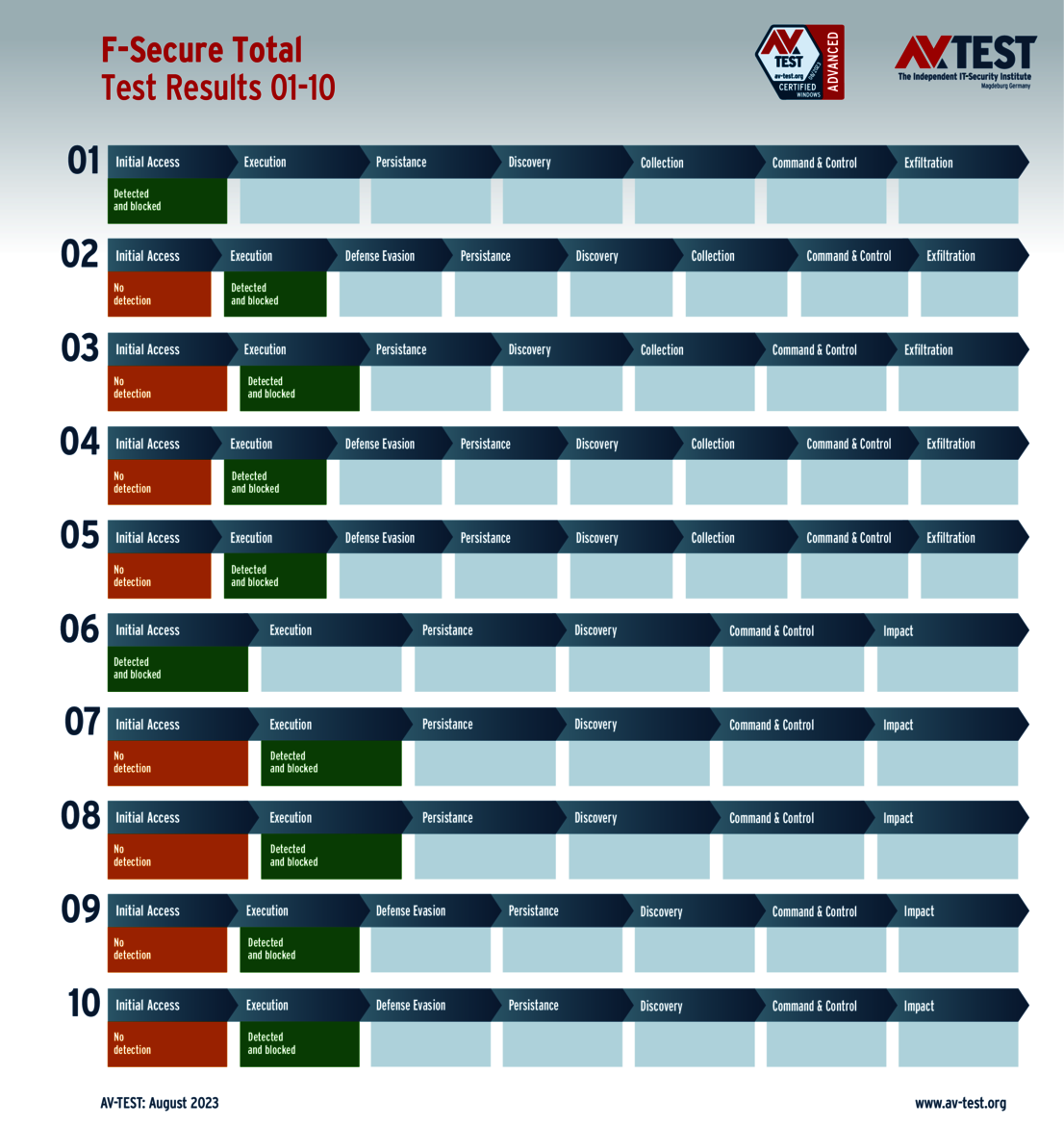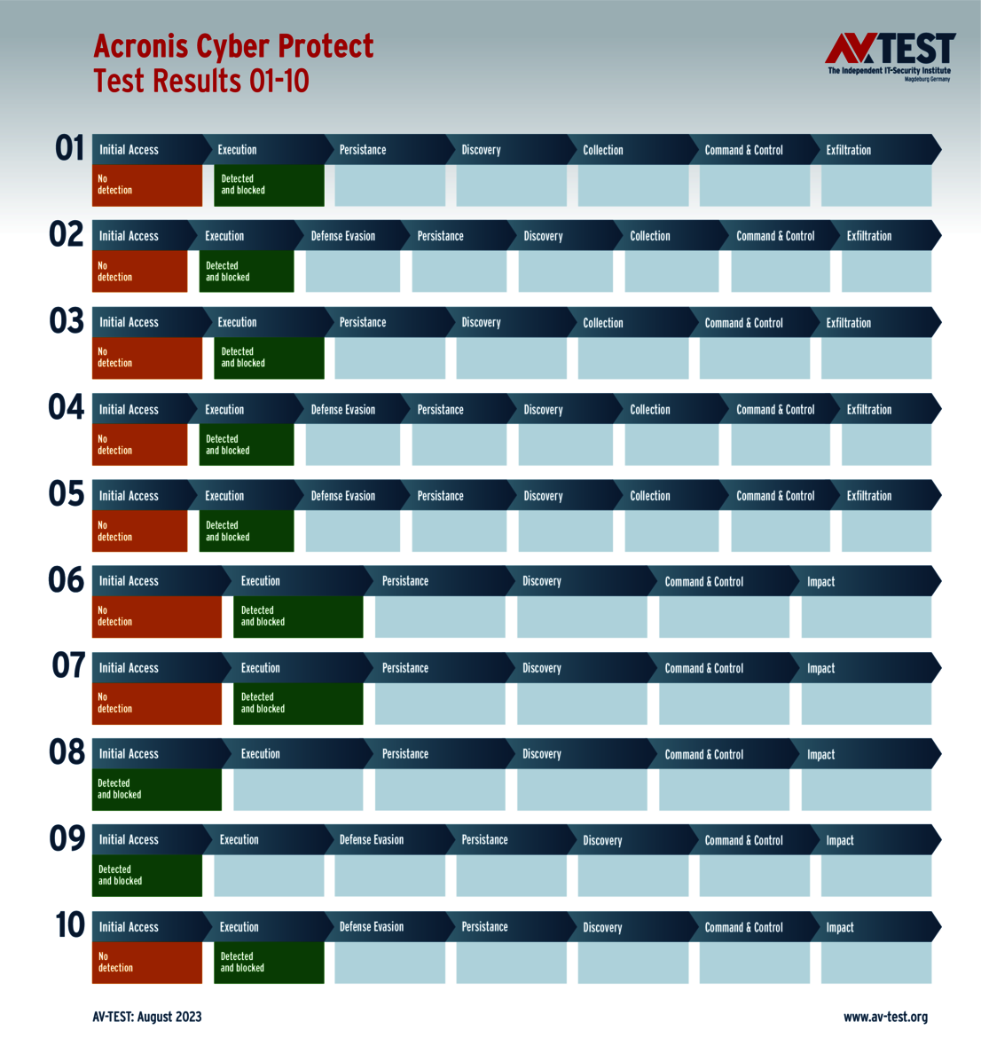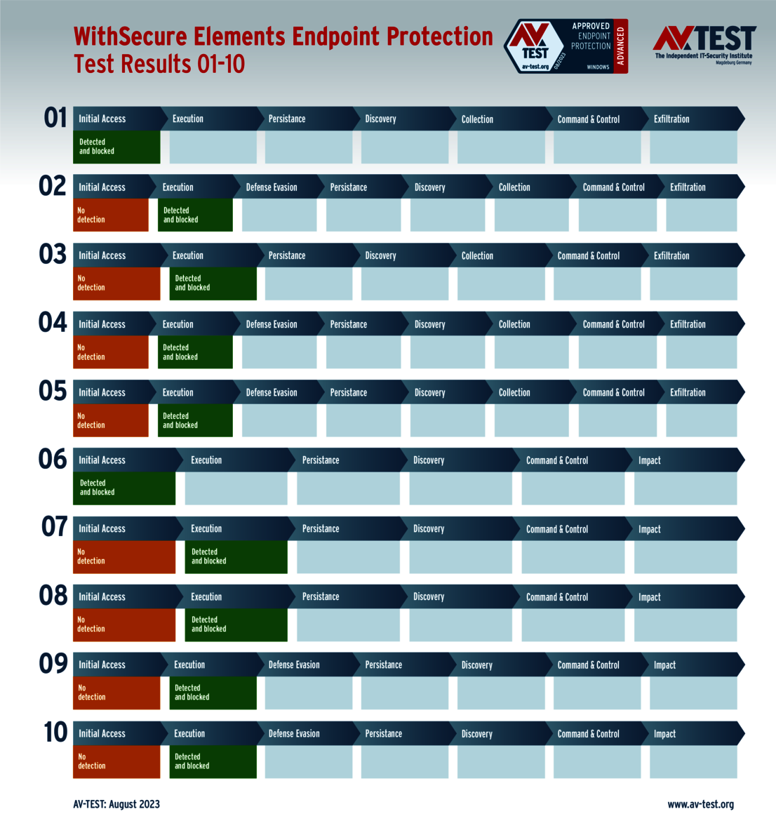 In the 10 test scenarios, the attackers deployed the latest techniques, such as DNS TXT Record, encrypted connections or even the Rust programming language. But the protection programs know all these variants and respond accordingly in the detection and defense. All in all: nearly exemplary performance!